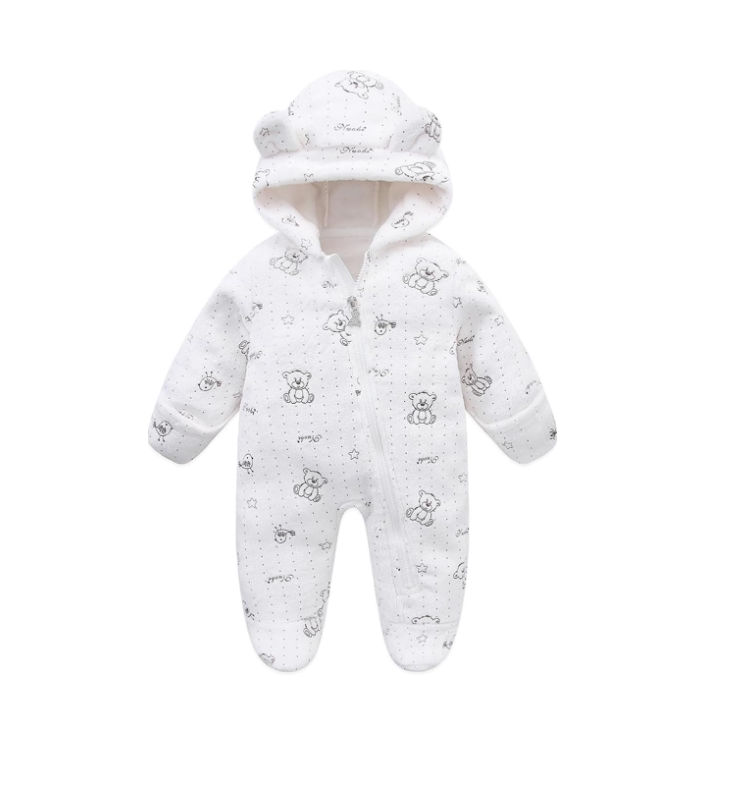 Combinezon bebelusi, Flausat, Cu urechi, Alb cu ursuleti