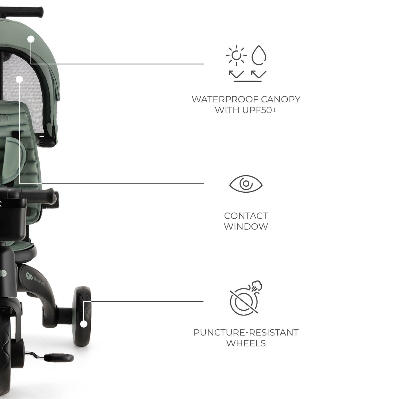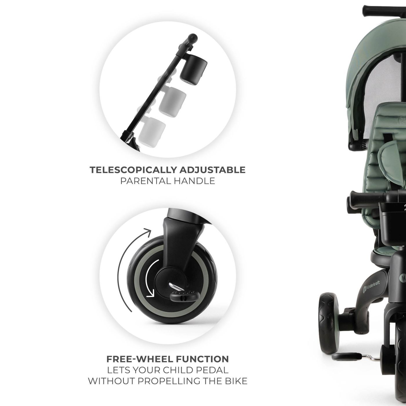 Tricicleta multifunctionala 5 in 1 KINDERKRAFT JAZZ 2, GREEN – pentru copii intre 9 luni si 5 ani Va prezentam KINDERKRAFT JAZZ 2 GREEN – tricicleta pliabila moderna 5 in 1, proiectata pentru copiii intre 9 luni si 5 ani. Aceasta tricicleta multifunctionala creste impreuna cu copilul tau, adaptandu-se nevoilor sale in fiecare etapa de dezvoltare. 5 moduri de utilizare – o singura tricicleta pentru multi ani KINDERKRAFT JAZZ 2 GREEN ofera configuratii diferite, pe care le poti adapta cu usurinta la varsta si abilitatile copilului: Etapa timpurie (9-18 luni): control total al parintelui cu masuri de protectie pentru cei mai mici dintre copii. Etapa de invatare (18-24 luni): copilul incepe sa pedaleze, in timp ce parintele continua sa controleze directia. Etapa de antrenament (2-3 ani): cel mic este mai independent si invata sa pedaleze si sa controleze directia. Etapa de independenta (3-4 ani): copilul merge singur pe tricicleta. Etapa de expert (4-5 ani): transformarea intr-o bicicleta fara pedale pentru cei mai avansati mici biciclisti. Pliere compacta – ideala zi de zi si in calatorii Datorita constructiei bine gandite, KINDERKRAFT JAZZ 2 GREEN se poate plia in cateva secunde fara a utiliza unelte. Dupa pliere, bicicleta ocupa putin spatiu, acest lucru facand transportul si depozitarea mai usoare, chiar si in spatiile mici. Dupa pliere pastreaza o pozitie stabila, asa ca o poti depozita atat vertical, cat si orizontal. Scaun pivotant CLICK&TWIST – flexibilitate si confort Scaunul care se roteste la 360° permite asezarea copilului cu fata sau spatele catre directia de mers. Aceasta solutie ii permite celui mic sa se simta in siguranta, permitandu-i contactul vizual cu parintele sau observarea lumii inconjuratoare. În plus, reglarea scaunului se poate face in ambele pozitii, potrivind bicicleta la inaltimea copilului si oferindu-i astfel confort sporit. Reglare pe mai multe niveluri – potrivita pentru nevoi care se schimba rapid KINDERKRAFT JAZZ 2 GREEN este dotata cu un maner telescopic pentru parinte, scaun si parasolar reglabile. Aceste functii permit adaptarea perfecta a bicicletei la nevoile copilului si preferintele insotitorului, oferind o utilizare confortabila si ergonomica. Siguranta si control – liniste pentru parinte Tricicleta KINDERKRAFT JAZZ 2 GREEN este dotata cu centuri de siguranta in 5 puncte, bariera detasabila si manere antialunecare. Functia de pedalare libera ii permite copilului sa invete sa pedaleze in timp ce parintele are control deplin asupra directie de deplasare. Perfecta pentru orice vreme – protectie tot anul Copertina impermeabila cu filtru UPF50+ il protejeaza pe copil de soare si ploile usoare. Unghiul de inclinare se poate regla pentru a asigura protectia optima in diferite conditii de vreme. În plus, fereastra incorporata permite observarea discreta a celui mic in timpul plimbarii. Prin alegerea tricicletei KINDERKRAFT JAZZ 2 GREEN, investesti intr-o bicicleta multifunctionala, care se adapteaza la nevoile copilului tau, asigurandu-i protectia, confortul si bucuria de a descoperi lumea in fiecare etapa de dezvoltare. KINDERKRAFT JAZZ 2 GREEN – Tricicleta pliabila 5 in 1 pentru copii de la 9 luni la 5 ani ✔ Creste impreuna cu copilul – cele 5 moduri de utilizare permit adaptarea bicicletei la varsta si abilitatile copilului, de la primele plimbari la mersul independent. ✔ Pliere compacta – sistemul de pliere rapida permite plierea bicicletei in cateva secunde fara a folosi unelte, facand mai usoare transportul si depozitarea, chiar si in spatii mici. ✔ Scaun pivotant 360° – datorita functiei CLICK&TWIST copilul poate calatori cu fata sau spatele catre directia de mers, bucurandu-se de sentimentul de siguranta si mai mult confort. ✔ Siguranta si control deplin – centurile in 5 puncte, bariera detasabila si functia de pedalare libera ii permit copilului sa invete sa pedaleze in timp de parintele controleaza directia de deplasare. ✔ Confort in orice conditii – copertina impermeabila cu UPF50+, manerul pliabil pentru parinte si rotile amortizate EVA asigura atat confortul copilului, cat si al insotitorului. Specificatii: Materialul cadrului: plastic Materialul rotilor: EVA Dimensiuni: Înaltimea bicicletei depliate pana la manerul parintelui: 92-100 cm Înaltimea bicicletei depliate pana la copertina: 70 cm Lungimea bicicletei depliate cu maner: 125 cm Lungimea bicicletei depliate fara maner: 93,5 cm Latimea bicicletei depliate: 52,5 cm Adancimea scaunului: 19 cm Latimea scaunului: 20 cm Latimea spatarului: 22 cm Lungimea spatarului: 40 cm Distanta de la sol la maner: 48,5-51,5 cm Diametrul rotilor din fata: 20 cm Diametrul rotilor din spate: 17 cm Distanta dintre rotile din spate: 52,5 cm Înaltimea bicicletei pliate fara maner, cu copertina: 78 cm Înaltimea bicicletei pliate fara maner, fara copertina: 65 cm Latimea bicicletei pliate fara maner: 34 cm Lungimea bicicletei pliate fara maner: 34 cm