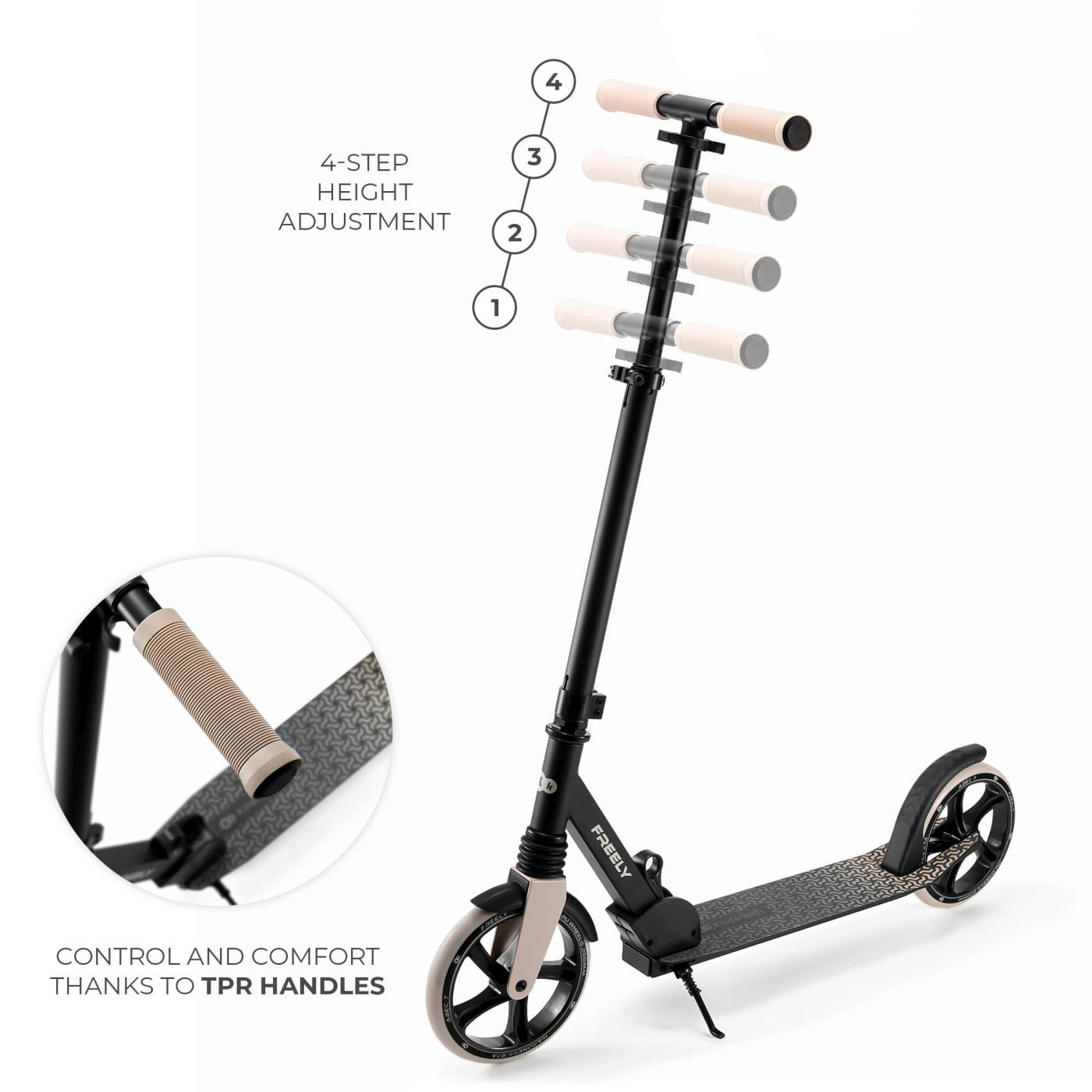 Trotineta pliabila Kinderkraft FREELY, BEIGE Trotineta pliabila pentru intreaga familie Cauti o trotineta care sa indeplineasca atat asteptarile iubitorilor tineri de activitate fizica, dar si asteptarile celor mai maturi? KINDERKRAFT FREELY BEIGE este un model care imbina durabilitatea, confortul si stilul, lucru care o face alegerea ideala pentru copii incepand cu varsta de 5 ani si adulti. Datorita constructiei solide, sistemului rapid de pliere si sarcinii maxime de 100 kg, KINDERKRAFT FREELY BEIGE este perfecta atat pentru utilizarea zilnica, cat si pentru aventuri mai dinamice pe doua roti. Constructie solida si durabila Realizata din aluminiu rezistent si otel, trotineta KINDERKRAFT FREELY BEIGE asigura durabilitatea chiar si in timpul utilizarii intense. Platforma ei stabila cu un strat suplimentar antialunecare garanteaza siguranta la mers pe orice suprafata, fiind ideala pentru aventuri in oras sau pe aleile parcurilor. Mers lin si rapid Trotineta KINDERKRAFT FREELY BEIGE este dotata cu rulmenti avansati ABEC-7 si roti mari PU cu duritate 87A si diametrul de 20 cm, care garanteaza un mers deosebit de lin si strabaterea distantelor mai lungi cu efort minim. Amortizarea rotii din fata asigura confortul si protejeaza articulatiile utilizatorului impotriva socurilor. Confort si reglare Avand inaltimea ghidonului reglabila in patru pozitii (de la 82 cm la 105 cm), KINDERKRAFT FREELY BEIGE se adapteaza inaltimii utilizatorului, asigurand potrivirea perfecta si ergonomia mersului. Manerele antialunecare TPR late asigura o prindere ferma - atat pentru copii, cat si pentru adolescenti si adulti. Practica si usor de utilizat KINDERKRAFT FREELY BEIGE poseda un mecanism dedicat rapid pentru pliere, care permite plierea rapida in numai cateva secunde. Trotineta este usor de depozitat si transportat, fiind ideala pentru utilizarea de zi cu zi, la scoala, la serviciu sau in timpul calatoriilor. Fara asamblare complicata Asamblarea initiala simpla este intuitiva datorita constructiei bine proiectate si instructiunilor incluse. Trotineta este livrata aproape in intregime asamblata, astfel ca tot ce trebuie sa faci este sa o depliezi, sa fixezi manerele cu ajutorul stifturilor si este gata de mers. Aceasta calitate o face pe KINDERKRAFT FREELY BEIGE ideala pentru persoanele care apreciaza utilizarea simpla si confortabila. Siguranta si frana de picior solida Frana de picior solida situata pe axul din spate al trotinetei garanteaza oprirea eficienta, lucru cheie pentru siguranta, mai ales in cazul vitezelor mai ridicate. KINDERKRAFT FREELY BEIGE indeplineste riguroasa norma de siguranta: EN 14619:2019, lucru ce confirma inca o data executia de inalta calitate si fiabilitatea. Design unic Fiecare versiune de culoare a lui KINDERKRAFT FREELY BEIGE se evidentiaza printr-un model grafic vectorial individual modern, care permite exprimarea propriului stil si gusturilor. Cricul practic permite sprijinirea stabila a trotinetei in orice loc. KINDERKRAFT FREELY BEIGE – mai mult decat o trotineta Este garantia distractiei dinamice si in siguranta pentru intreaga familie, indiferent de varsta sau abilitati. Ofera-ti tie si celor apropiati cea mai buna experienta pe roti cu KINDERKRAFT FREELY BEIGE, trotineta care creste impreuna cu voi si nevoile voastre. KINDERKRAFT FREELY BEIGE – trotineta pliabila pentru copii si adulti Trotineta universala: Ideala pentru copii incepand cu varsta de 5 ani, adolescenti si adulti pana la 100 kg. Constructie rezistenta: Realizata din materiale durabile si rezistente, care ii asigura rezistenta chiar si in conditii de utilizare intensa. Mecanism simplu si rapid de pliere: Permite plierea si deplierea usoare si rapide, in numai cateva secunde. Mers lin cu amortizare: Rulmentii avansati ABEC-7 si rotile PU mari cu diametrul de 20 cm asigura mersul confortabil si strabaterea cu usurinta a distantelor mai lungi. Siguranta si confort: Manerele TPR confortabile si frana de picior solida sporesc controlul si siguranta. Ghidon cu inaltime reglabila: De la 82 cm la 105 cm, se adapteaza la inaltimea utilizatorilor. Design unic: Modelele grafice individuale de pe platforma permit exprimarea propriului stil. Îndeplineste normele de siguranta EN 14619:2019: Acest lucru confirma calitatea inalta de executie si fiabilitatea. Specificatii: Materialul cadrului: aluminiu si otel Materialul rotilor: PU Dimensiuni: Dimensiunile trotinetei asamblate: 82 x 32,5 x 11 cm Înaltime totala: 82,5-107,5 cm Latimea ghidonului: 37 cm Lungimea totala a platformei: 54 cm (cu roata din spate: 66 cm) Lungimea utilizabila a platformei: 33,5 cm Latimea platformei: 11 cm Diametrul rotilor: 20 cm Greutate: 4,9 kg