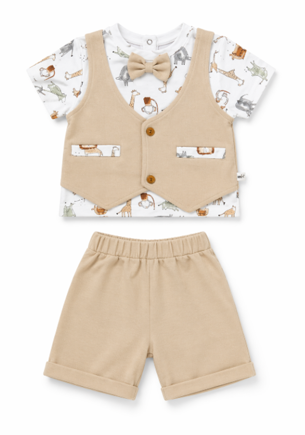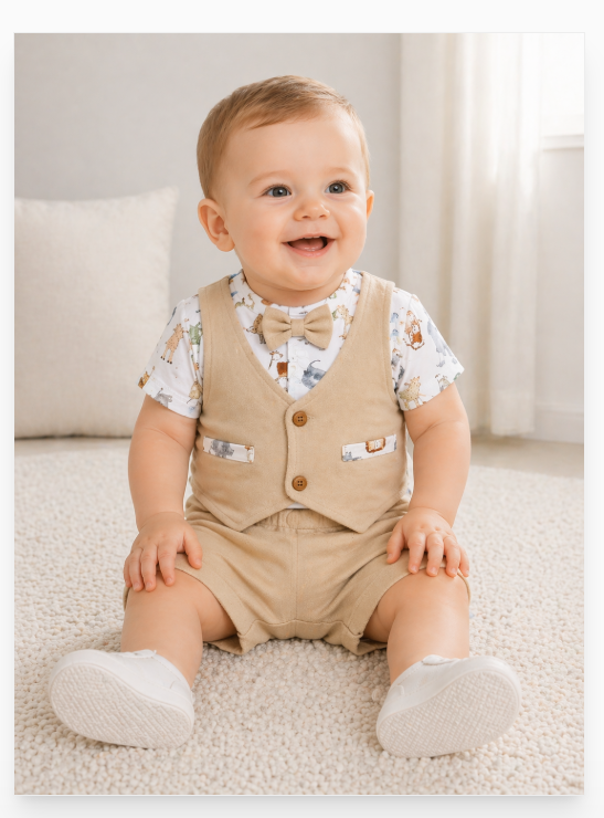 Alege un set complet pentru bebeluși, realizat din bumbac de calitate superioară, ideal pentru pielea delicată a celor mici. Acest outfit modern pentru băieți include tricou cu imprimeu, vestă elegantă, pantaloni comozi și papion asortat – combinația perfectă între confort și stil.