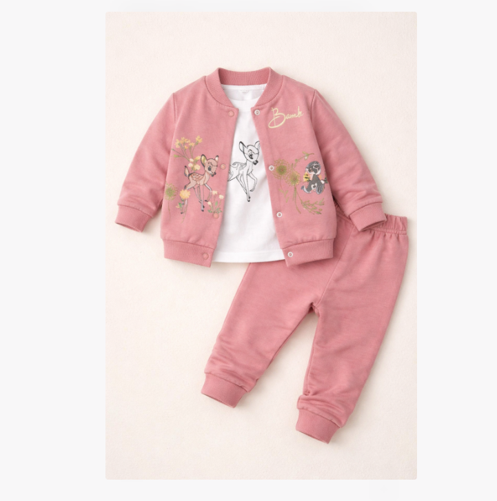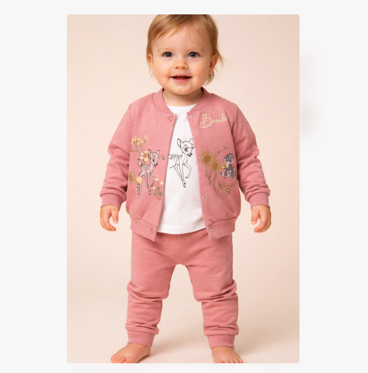 Designul delicat, în nuanță de roz pudrat, este decorat cu personaje Bambi, perfecte pentru un look adorabil și modern. Treningul este potrivit atât pentru purtare zilnică, cât și pentru ieșiri sau cadouri speciale.