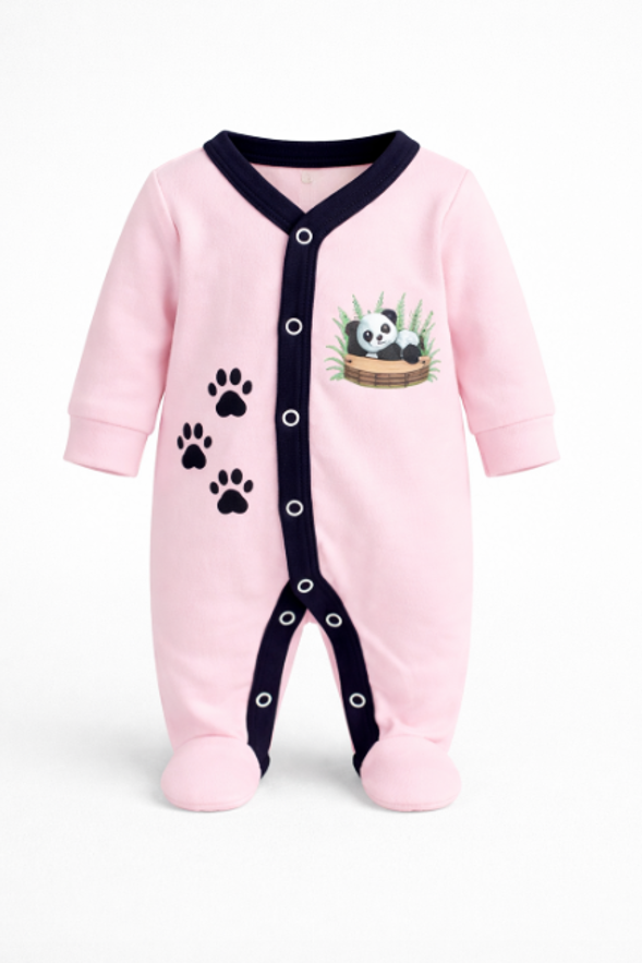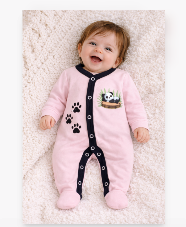Designul practic cu capse pe toată lungimea permite îmbrăcarea rapidă și schimbarea ușoară a scutecului, fără disconfort pentru copil. Modelele sunt decorate cu imprimeuri adorabile – ursuleți, panda și mesaje vesele – perfecte pentru un look modern și jucăuș.
