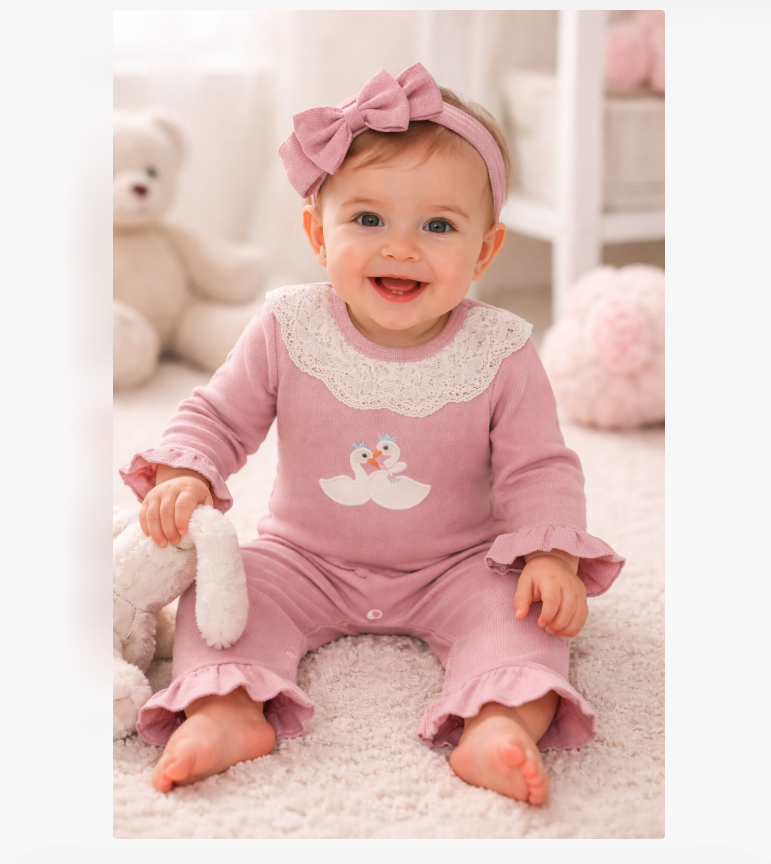 Descoperă un set adorabil pentru fetițe, perfect pentru ținute de zi cu zi sau ocazii speciale. Format din salopetă roz pudrat și bentiță asortată, acest outfit combină confortul cu un design delicat și feminin, ideal pentru pielea sensibilă a bebelușilor.