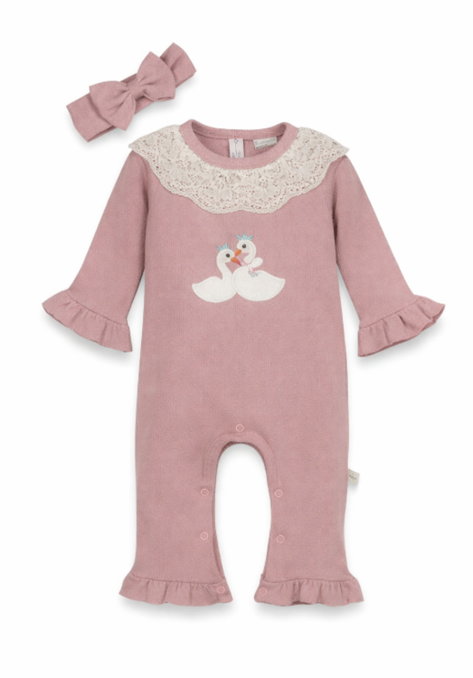 Realizat din material moale și plăcut la atingere, setul oferă libertate de mișcare și o potrivire lejeră. Gulerul din dantelă fină și aplicația cu lebede brodate adaugă un plus de eleganță, transformând această salopetă într-o alegere inspirată pentru ședințe foto, vizite sau plimbări.
