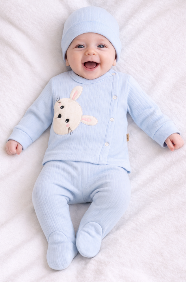 Setul include o bluza prevăzuta cu mănuși integrate, ideala pentru a proteja bebelușul de zgârieturi accidentale. Pantaloni cu botosei integrate mențin picioarele micuțului mereu calde și confortabile, eliminând grija pierderii șosetelor. Iar bereta asortată completează perfect ținuta, adăugând un plus de stil.