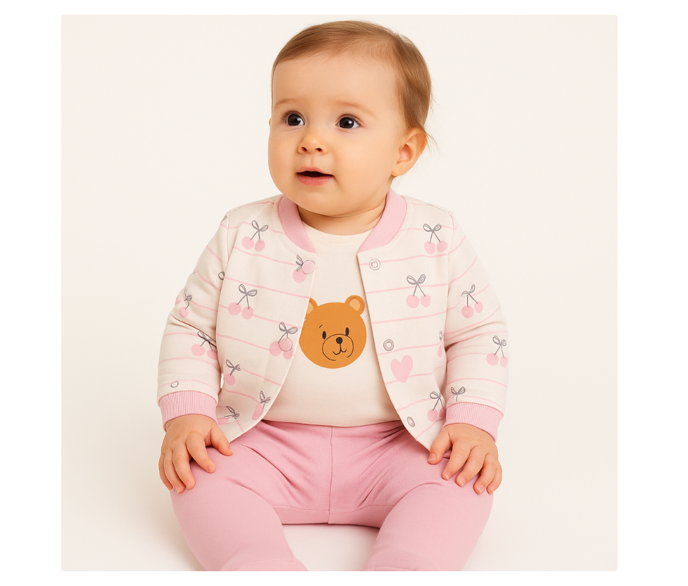 Compleu 3 piese, cu body, Ursuletul la cirese, Roz