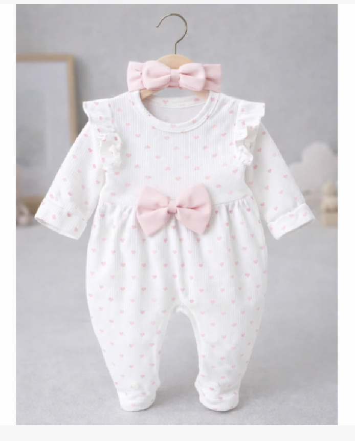 Salopetă delicată pentru bebeluși, realizată din material moale și confortabil, decorată cu inimioare roz și completată de o bentiță adorabilă. Ideală pentru fotografii, ocazii speciale sau purtare zilnică.