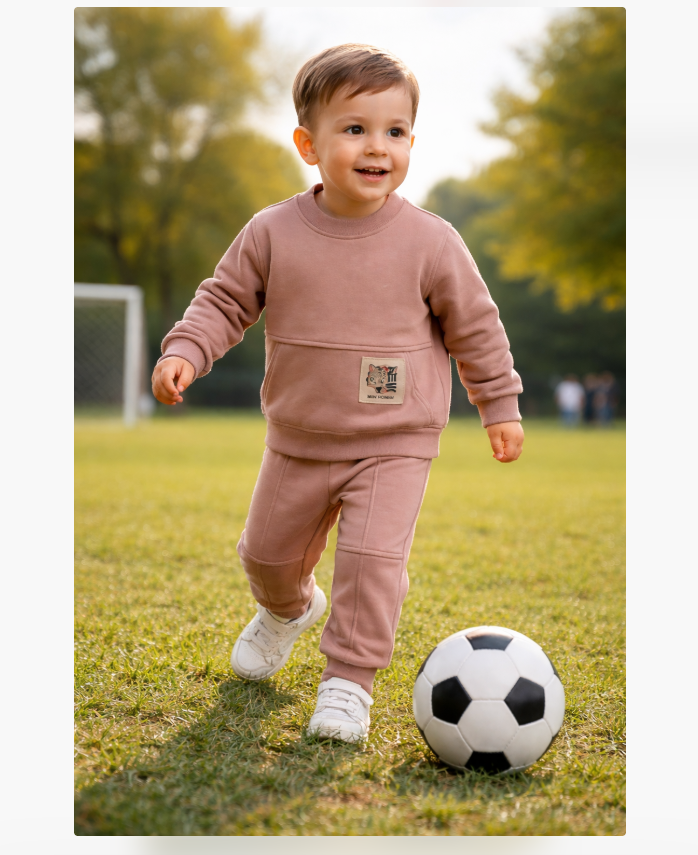 Acest trening pentru băieți este alegerea perfectă pentru copii activi care au nevoie de confort și libertate de mișcare în fiecare zi. Setul este compus dintr-o bluză tip sweatshirt cu mânecă lungă și pantaloni sport asortați, realizate din material moale și plăcut la atingere. Designul modern, într-o nuanță elegantă de maro deschis, este completat de un patch decorativ cu tigru, oferind un look cool și jucăuș.