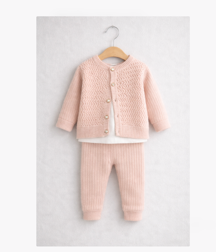 - Pantaloni tricotati asortați: Confortabili și stilați, perfecti pentru joacă și relaxare.