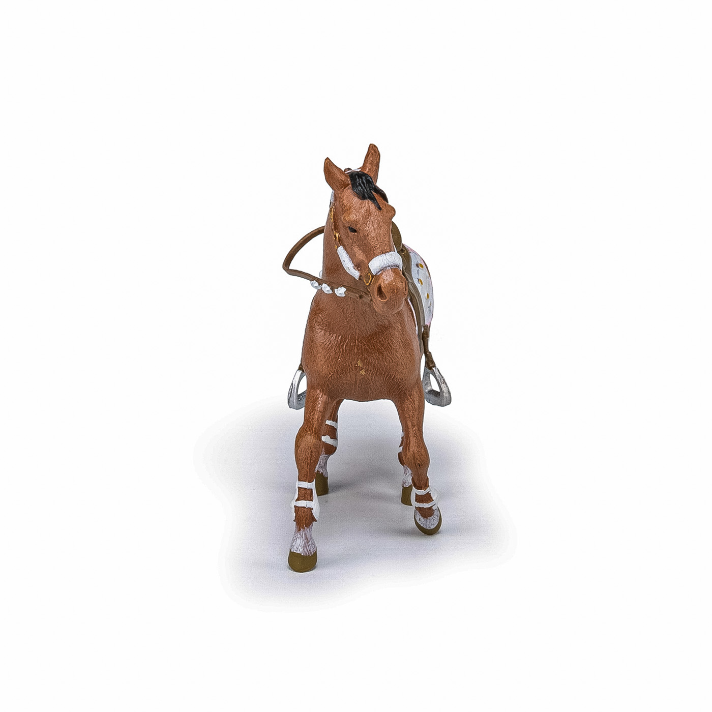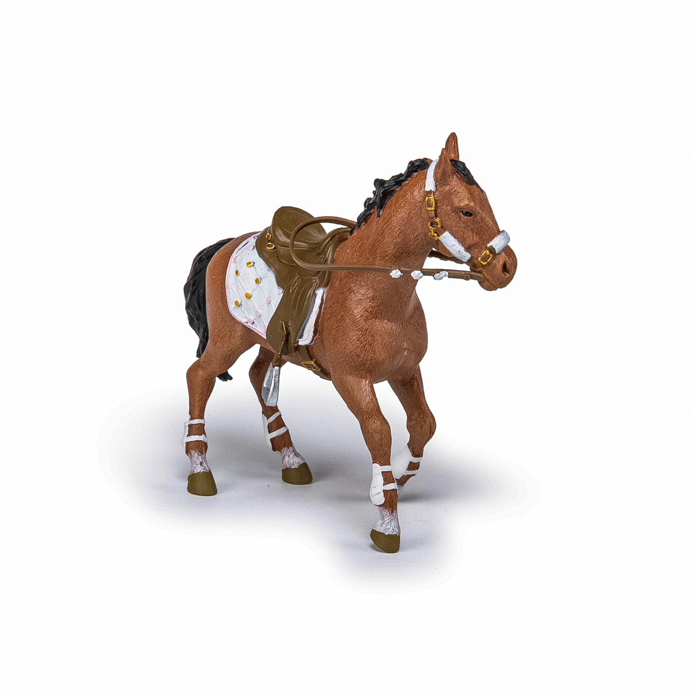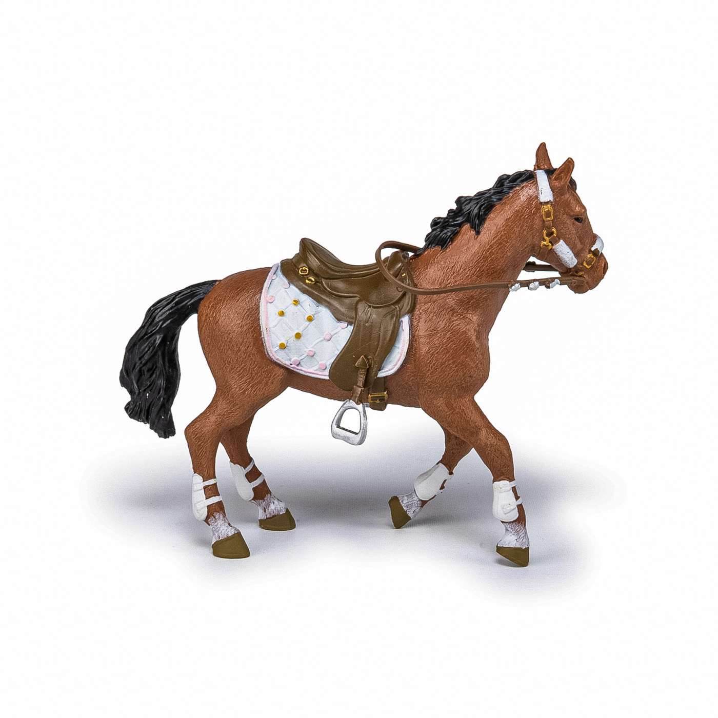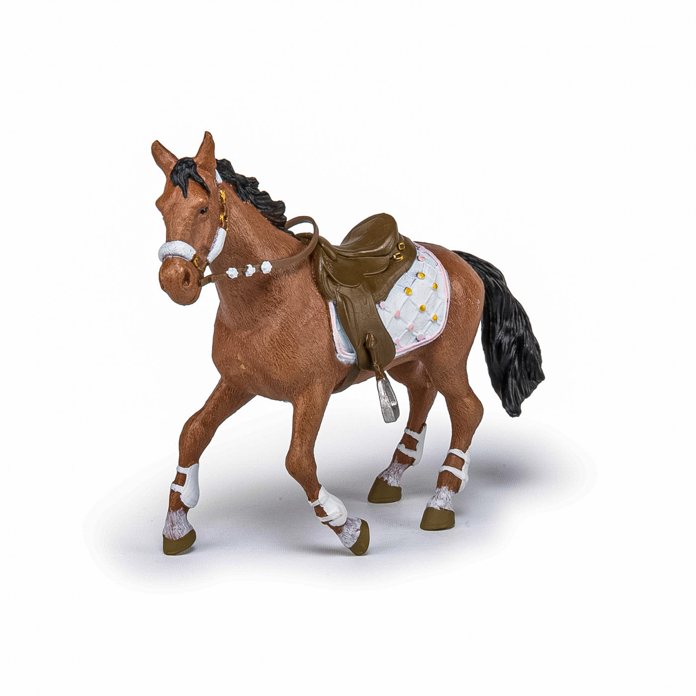 Faceti o plimbare prin campuri cu ecvinele Papo, participati la concursuri de sarituri sau chiar la cursuri de dresaj. Calaretul la moda si calul ei si-au imbracat tinutele de iarna, sunt pregatiti pentru o noua plimbare in padurea inzapezita! Produsul are urmatoarele dimensiuni: 12.5 x 3.5 x 10.5cm si este recomandat copiilor cu varsta peste 3 ani. De mai bine de 20 de ani, Papo inoveaza constant si ii face pe copii din intreaga lume sa viseze cu o gama bogata de peste 600 de produse, reprezentand 12 lumi, animale si personaje. De la modelul original la serie, fiecare dintre figurinele Papo a fost conceputa si creata in Franta pentru a fi fabricata intr-o permanenta preocupare pentru calitate. Pictate manual, atentia la detalii este acum recunoscuta. Figurinele Papo se disting prin acuratete si realism, detaliile sunt de asa natura incat am putea crede ca se vor pune in miscare.