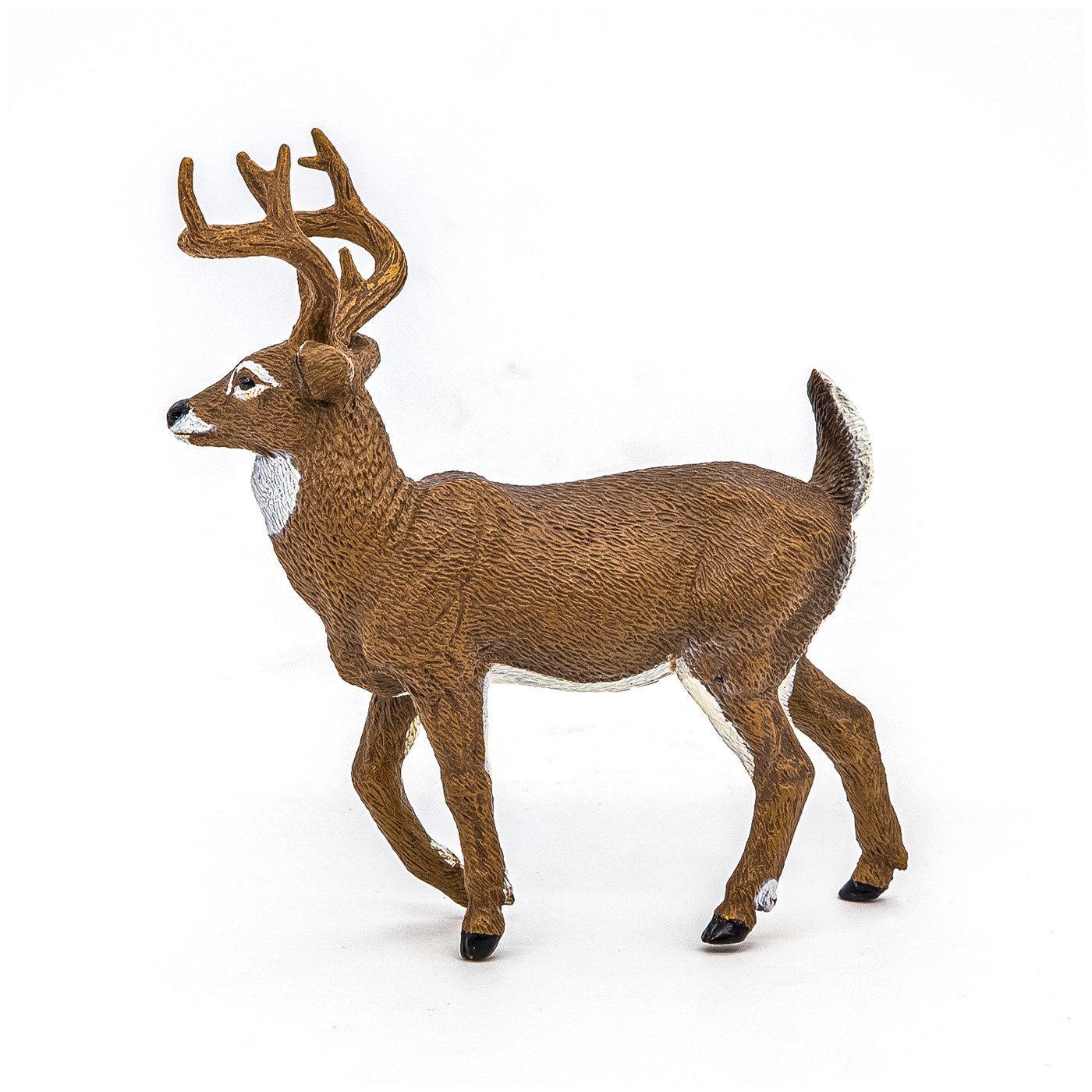 Vizitati cerbul cu coada alba maiestuoasa in inima padurilor, explorati savana alaturi de puternicul tigru de Sumatra sau urcati pe varfuri acoperite de zapada pentru a cauta leopardul de zapada. Cerbii cu coada alba sunt mamifere, raspandite predomimant pe teritoriul Americii de Nord si Centrale. Sunt intalnite in special in zone impadurite, putand sa se fereasca de pradatori prin coloritul lor neutru. Cerbii cu coada alba sunt animale sperioase, mereu alerte, acestea isi ridica cozile albe in aer in caz de pericol. Cerbii cu coada alba, sunt vanati pentru coarnele lor, acestea fiind expuse ca trofee valoroase. Produsul are urmatoarele dimensiuni: 10.4 x 4 x 10.9cm si este recomandat copiilor cu varsta peste 3 ani. De mai bine de 20 de ani, Papo inoveaza constant si ii face pe copii din intreaga lume sa viseze cu o gama bogata de peste 600 de produse, reprezentand 12 lumi, animale si personaje. De la modelul original la serie, fiecare dintre figurinele Papo a fost conceputa si creata in Franta pentru a fi fabricata intr-o permanenta preocupare pentru calitate. Pictate manual, atentia la detalii este acum recunoscuta. Figurinele Papo se disting prin acuratete si realism, detaliile sunt de asa natura incat am putea crede ca se vor pune in miscare.
