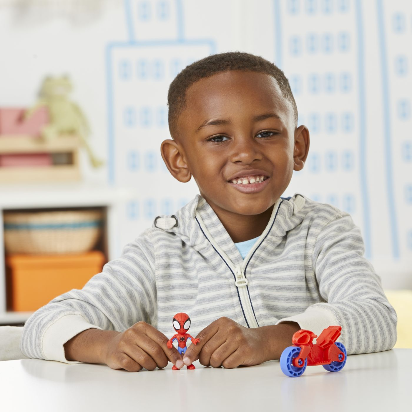 Este timpul Spidey! Aceste jucarii Spidey and His Amazing Friends vin cu o silueta si o motocicleta pentru o joaca plina de actiune. Silueta de 2,5 inci poate merge cu adevarat cu bicicleta, astfel incat prescolarii isi pot imagina ca se vor ajuta cu echipa Spidey. Cu aceste seturi de figurine si vehicule Marvel prescolare, distractia este la o plimbare distanta! Aceste seturi de jucarii Spidey sunt cadouri grozave de sarbatori sau de ziua de nastere pentru copiii de la 3 ani in sus, care iubesc aventurile lui Spidey, Miles Morales: Spider-Man, Ghost-Spider si toti prietenii si dusmanii lor! Acest pachet contine personajul Spidey.