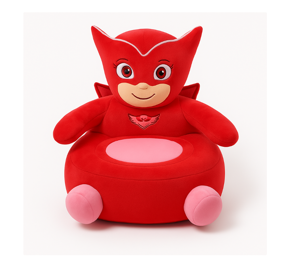 Fotoliu din plus Bufnita - Eroi in Pijama cu forma de mascota din plus, cu cap, maini si picioare, cu design deosebit sub forma de fotoliu din plus pentru copii.