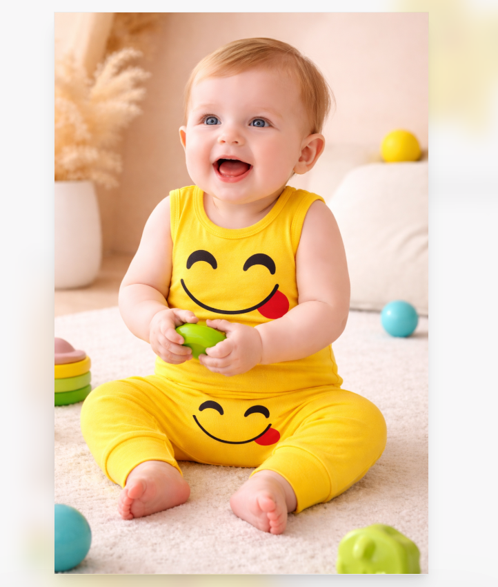 Descoperă seturile adorabile pentru bebeluși formate din body și pantaloni în nuanță vibrantă de galben, decorate cu imprimeuri vesele tip emoji. Aceste outfituri sunt create special pentru confortul și libertatea de mișcare a bebelușilor de 3-12 luni, fiind ideale pentru joacă, somn sau ieșiri zilnice.