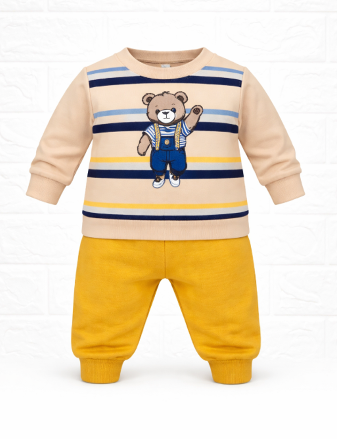 O alegere practică și adorabilă pentru garderoba micuțului tău, acest compleu sport pentru bebeluși combină confortul cu un design jucăuș. Setul este format dintr-o bluziță bej cu imprimeu ursuleț în stil baseball și pantaloni bleu cu talie elastică, ideali pentru mișcare și joacă zilnică.