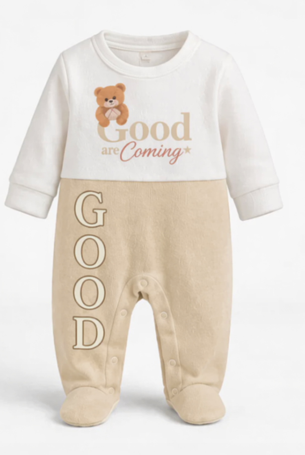 Designul practic cu capse pe toată lungimea permite îmbrăcarea rapidă și schimbarea ușoară a scutecului, fără disconfort pentru copil. Modelele sunt decorate cu imprimeuri adorabile – ursuleți, panda și mesaje vesele – perfecte pentru un look modern și jucăuș.