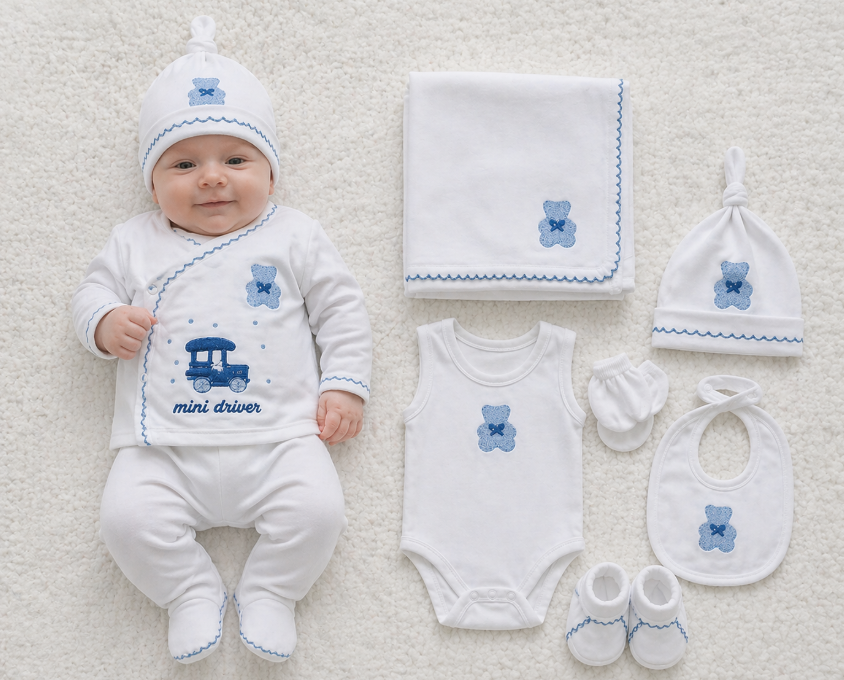Descoperă seturile complete pentru nou-născuți, realizate din bumbac 100% moale și delicat, special concepute pentru pielea sensibilă a bebelușilor. Acest set pentru baieti include piese esențiale precum bluză cu mânecă lungă, pantaloni, căciuliță, body, vestă, botoșei și accesorii, toate într-un design armonios, cu imprimeu adorabil.