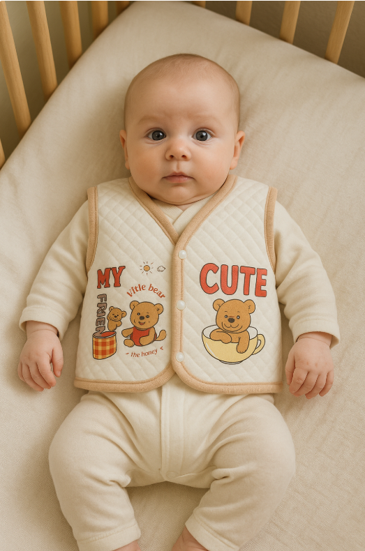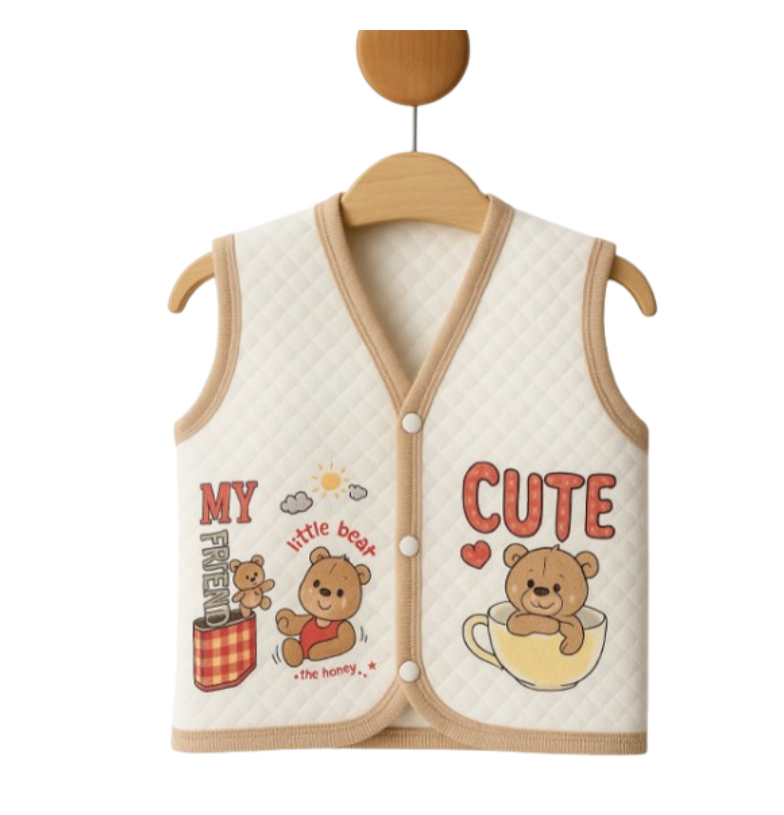 Materialul moale și matlasat oferă căldură ușoară și confort, fiind ideal pentru a fi purtată peste body sau pijama, mai ales în sezonul rece. Închiderile cu capse o fac ușor de îmbrăcat și scos, iar imprimeul cu ursuleți și curcubeu adaugă un aspect adorabil și vesel — perfect pentru micuți.