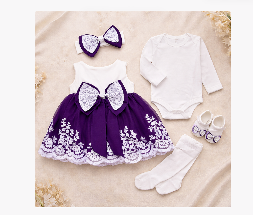 • Rochie: Rochița inclusă în set adaugă un plus de eleganță și rafinament. Designul său adorabil și materialul fin o fac ideală pentru ocazii speciale sau pur și simplu pentru a transforma fiecare zi într-o sărbătoare.