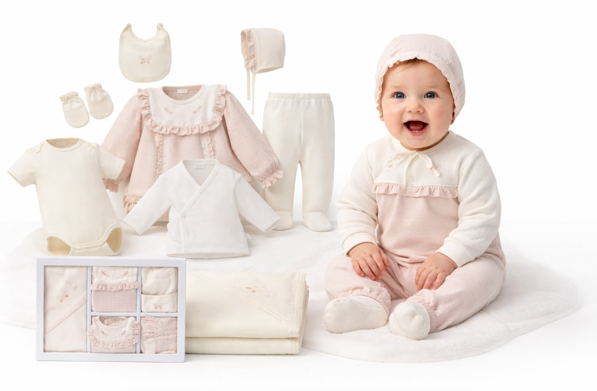 Acest set premium de haine pentru bebeluși fete îmbină eleganța, confortul și rafinamentul într-o prezentare de lux. Salopeta delicată, în tonuri pastel crem și roz pudrat, este realizată din materiale moi și prietenoase cu pielea sensibilă a bebelușului. Căciulița asortată completează perfect ținuta, oferind un look sofisticat și armonios.