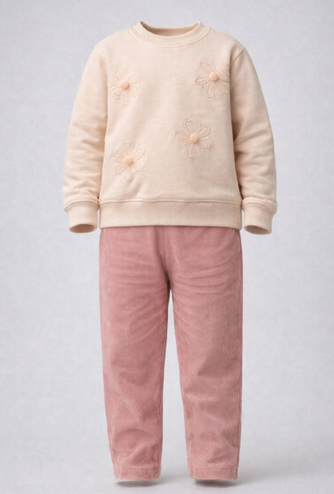 Un set delicat și confortabil pentru fetițe, perfect pentru joacă, plimbări sau activitățile zilnice. Combinația dintre bluza crem cu flori brodate și pantalonii roz din reiat oferă un look modern, dar în același timp foarte comod pentru copii.