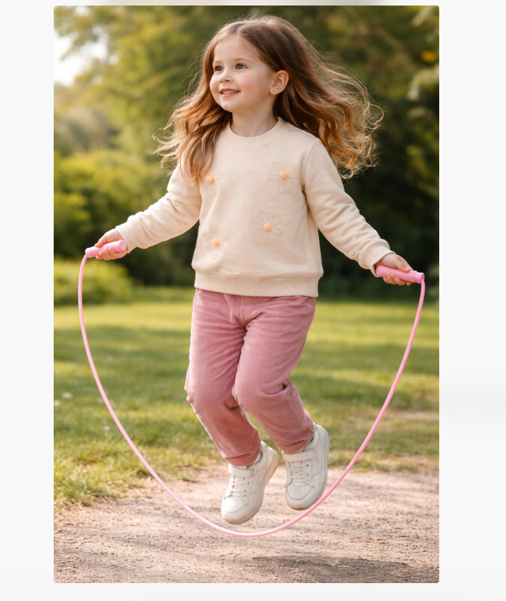 Pantalonii roz din reiat sunt ușori, rezistenți și ideali pentru joaca activă. Croiala lejeră și talia confortabilă permit copilului să se miște liber, fie că sare coarda, se joacă în parc sau merge la grădiniță.