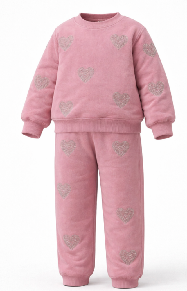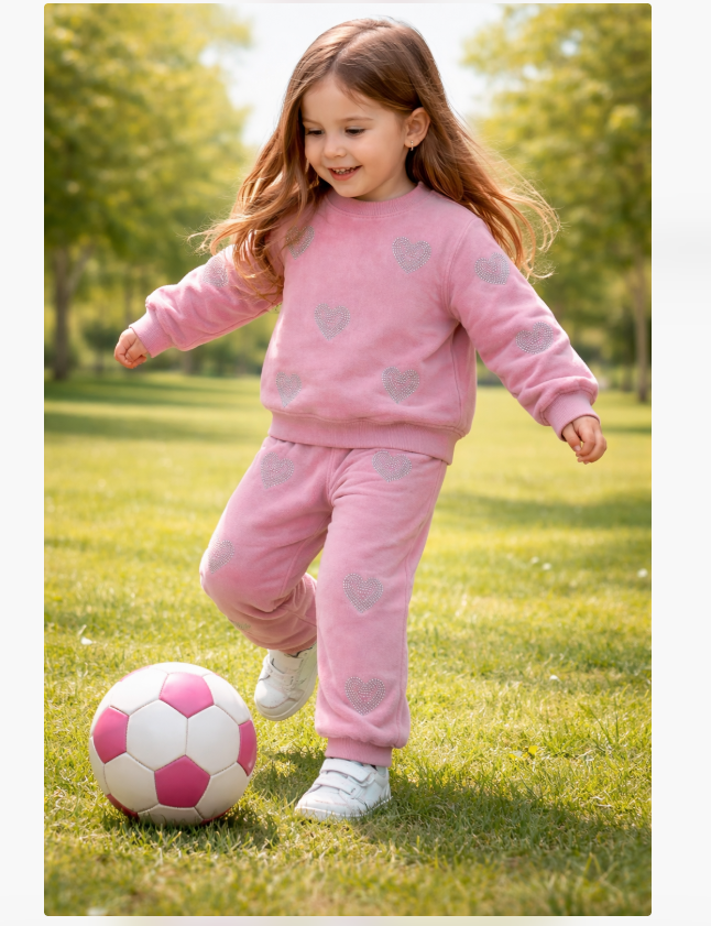 Descoperă un trening pentru fete confortabil și stylish, perfect pentru joacă, plimbări sau activități zilnice. Acest set sport pentru fete din catifea moale este realizat într-o nuanță delicată de roz și este decorat cu inimioare strălucitoare din strasuri, oferind un look modern și adorabil.
