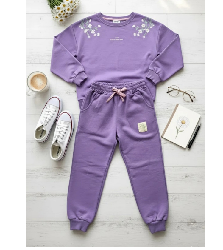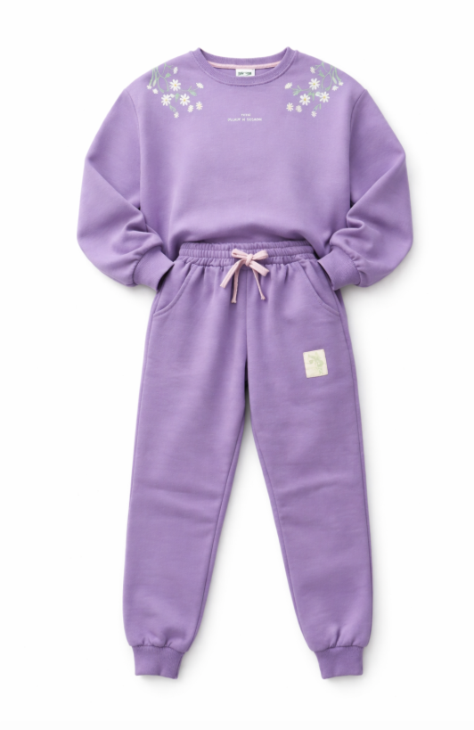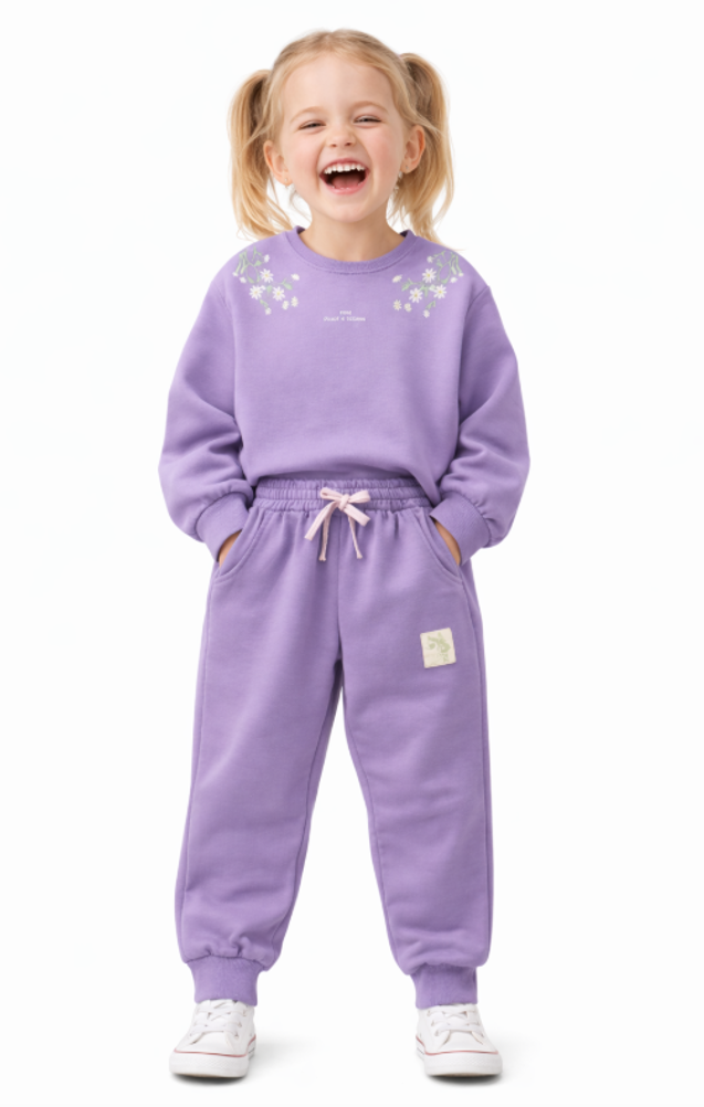 Descoperă un trening pentru fetițe confortabil și modern, perfect pentru joacă, plimbări sau grădiniță. Acest set sport pentru fete format din bluză și pantaloni, într-o nuanță delicată de mov, este decorat cu broderii florale delicate, oferind un look vesel și feminin.