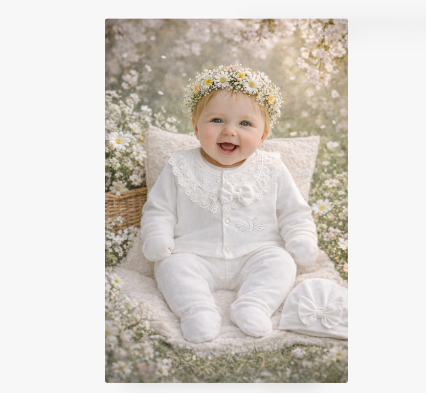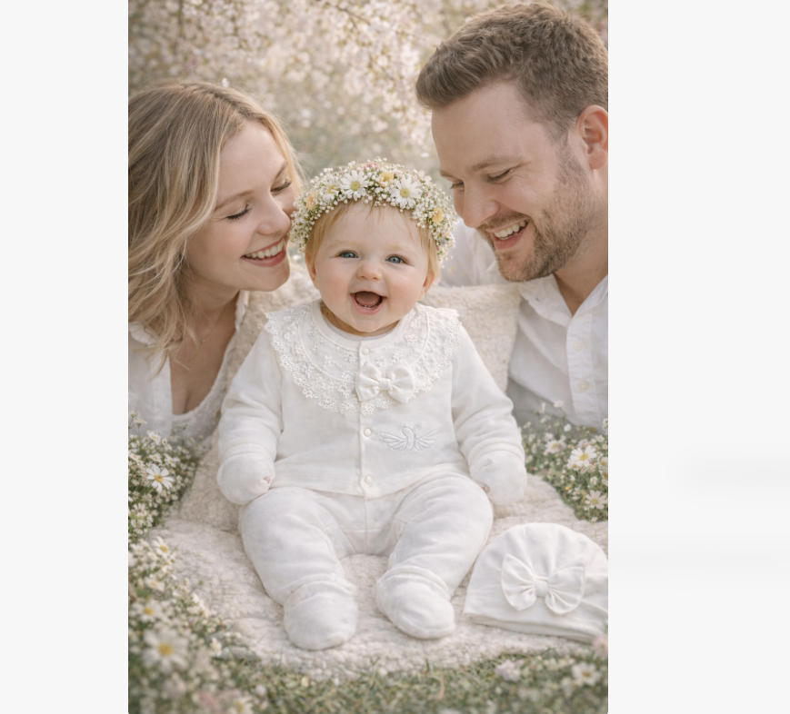 Este alegerea perfectă pentru o ședință foto de primăvară, pentru ziua botezului sau pentru acele zile în care vrei pur și simplu să o privești și să știi că porțiunea asta mică de lume este a ta.