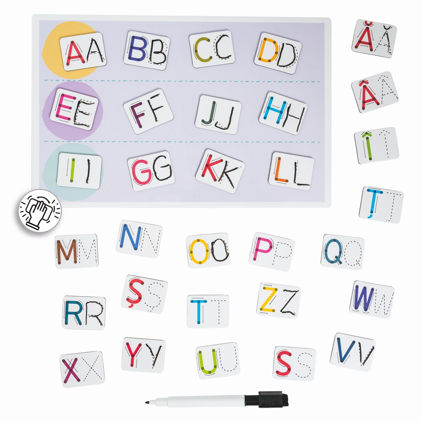 O jucarie educativa progresiv, creat special pentru copiii de la 5 ani, care transforma invatarea literelor intr-o activitate distractiva si interactiva. Plansetele colorate ii incurajeaza pe cei mici sa invete sa citeasca si sa scrie prin exercitii simple si captivante. Pas cu pas, copilul invata sa asocieze obiectele cu literele corespunzatoare, sa exerseze scrierea si sa formeze primele sale cuvinte. Datorita markerului special si buretelui incluse, exercitiile pot fi sterse si reluate de oricate ori doreste copilul, oferindu-i libertatea de a invata in propriul ritm. Un mod jucaus si eficient de a dezvolta vocabularul, atentia si coordonarea mana-ochi!