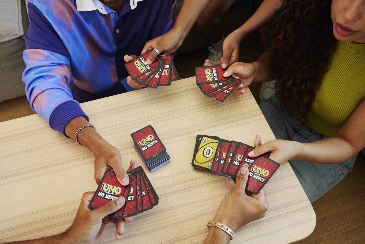 Jocul UNO Show 'em No Mercy adauga inca 56 de carti, reguli speciale si carti de actiune super dure pentru cea mai brutala editie a UNO vreodata! Cartile de actiune mai dificile, cum ar fi Skip Everyone, Wild Draw 6 si chiar Wild Draw 10, fac jocul nemilos! Regula de stivuire permite jucatorilor sa treaca penalizarea (Remiza +2, +4, +6, +10) urmatorului jucator pana cand cel care nu poate juca trebuie sa ia toate cartile combinate! Ori de cate ori o carte „7” sau „0” este jucata, jucatorii trebuie sa schimbe cartile cu un alt jucator! Regula Mercy inseamna ca, daca un jucator primeste peste 25 de carti in mana, este in afara jocului! Mai multe carti inseamna mai multe sanse de a arata adversarilor absolut nicio mila! Este un cadou grozav pentru a intensifica actiunea in noptile de jocuri cu prietenii si familia, calatorii si petreceri!