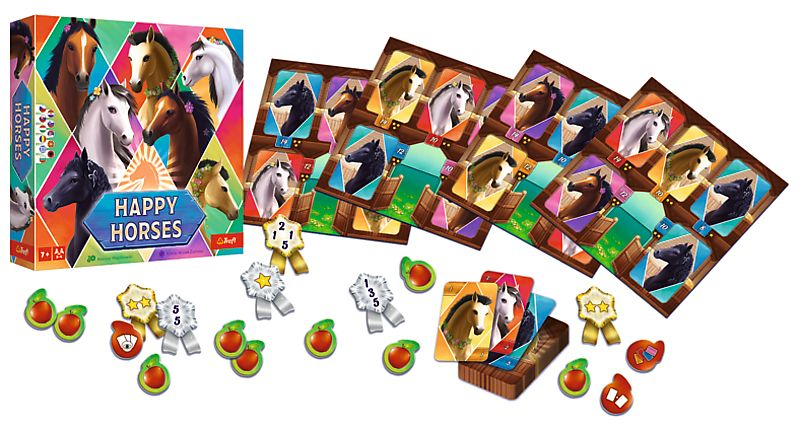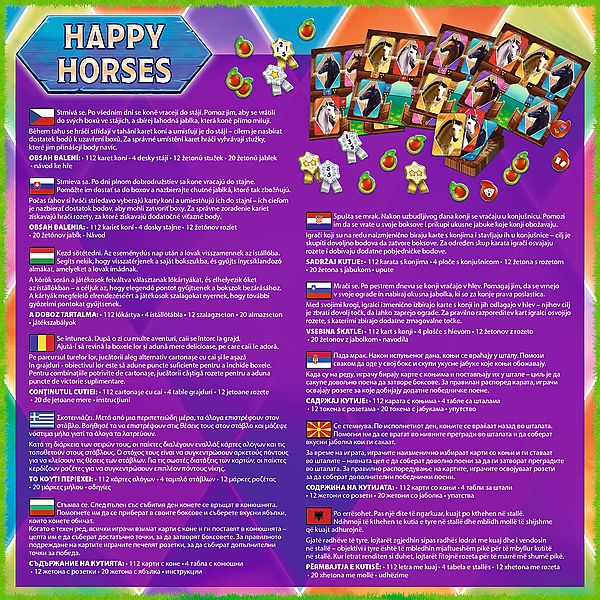 Jocul de masa „Happy Horses” ofera o experienta de joc incantatoare, de inalta calitate, in care caii joaca rolul principal. Jocul consta dintr-un set bogat ilustrat si detaliat de carti de cai, cu un total de 112 variante, care fac fiecare joc unic si variat. Jucatorii au la dispozitie si patru table stabile, intre care trebuie sa manevreze strategic pentru a obtine cele mai multe puncte posibile. În timpul jocului interesant, jucatorii trebuie sa foloseasca, de asemenea, jetoane panglica si jetoane diamant, care totalizeaza 12 si, respectiv, 20 de piese si ofera oportunitati suplimentare si avantaje strategice pentru jucatori. Esenta jocului este ca, atunci cand se intuneca, trebuie sa ajuti caii sa se intoarca la propriile boxe si sa colecteze mere in acest proces. La final, castigatorul este cel care aduna suficiente mere si puncte pentru a inchide cutiile. Jocul este recomandat pentru varsta de 7 ani si poate fi o alegere excelenta pentru toti copiii si adultii, in special cei interesati de cai si jocuri de societate de strategie. Joc de masa Happy Horses- 112 carti de cai- 4 scanduri stabile- 12 jetoane panglica- 20 de felii de mere.