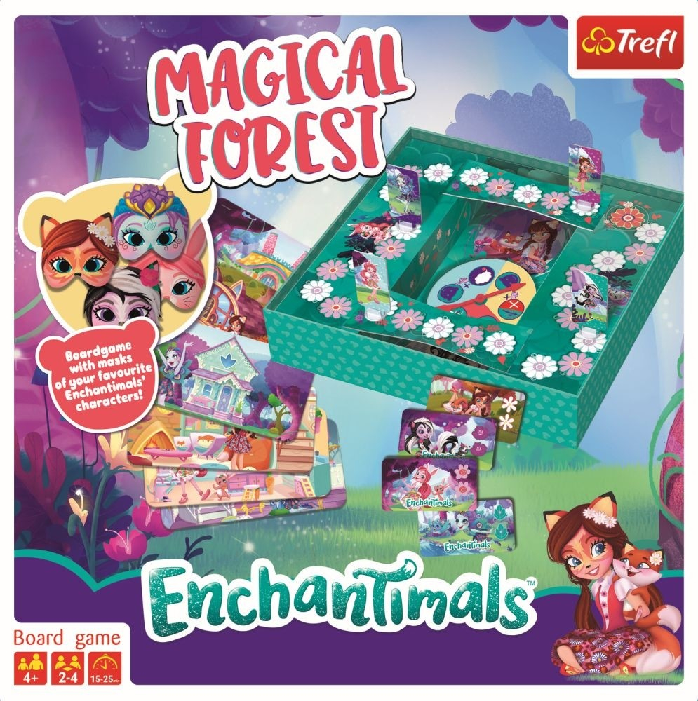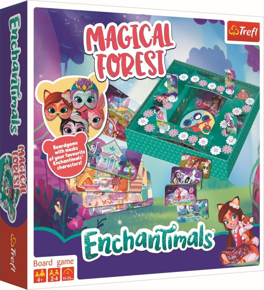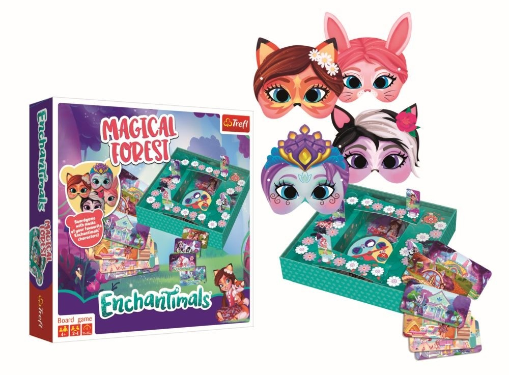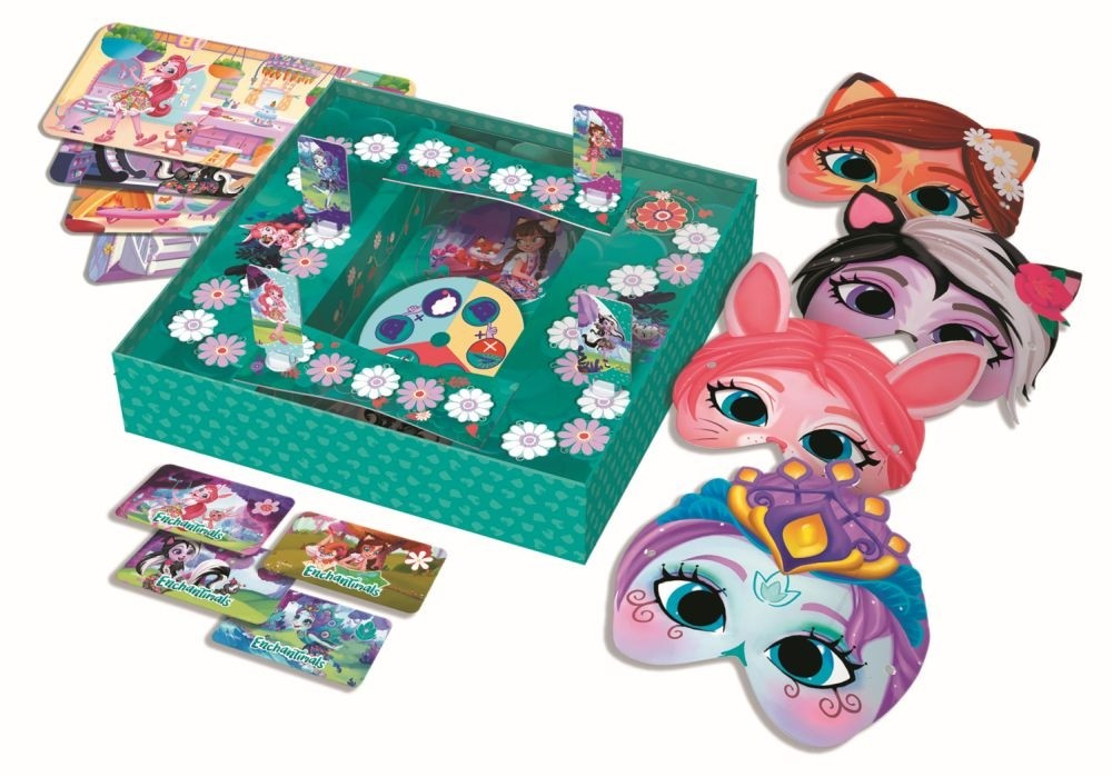 Bree si Twist, Patter si Flap, Sage si Caper, precum si Felicity si Flick pornesc intr-o aventura in padure. Însoteste-le! Joaca un joc in care trebuie sa fii si atent, si istet. S-ar putea sa ai nevoie si de putin noroc! Patrunde in lumea colorata Enchantimals! Continutul cutiei: • tabla de joc, cu un disc cu diviziuni inserat in cutie • 2 poduri, de plasat pe tabla de joc • 4 masti • 4 benzi care se ataseaza la masti • 4 miniaturi din hartie • 4 suporturi pentru miniaturi din hartie • 4 cartonase cu casele Enchantimals • 4 table pentru jucatori • sageata • zar • instructiuni