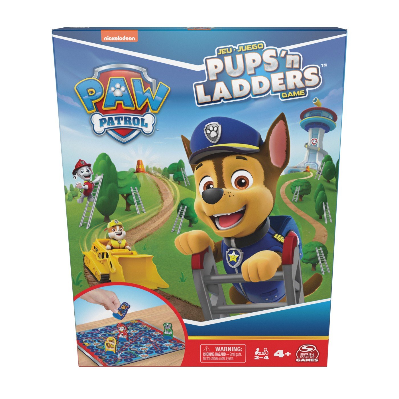 În acest joc captivant, de PATRULA CATELUSILOR, de la Spin Master Games, pentru copii cu varste de 4-8 ani, invinge primul catelus care termina misiunea! Catelusii sunt in misiune! Trebuie sa-si croiasca drumul pana in varf si sa aterizeze in punctul 100. Vor lua cateva scurtaturi, vor urca pe scari, iar conurile de trafic ii vor face sa alunece inapoi. Cuprinde 1 tabla de joc, 1 foaie de perforatie (4 miscatoare si 1 rotita), 4 suporturi pentru miscatoare, 1 sageata rotitoare (2 parti) si 1 foaie cu instructiuni