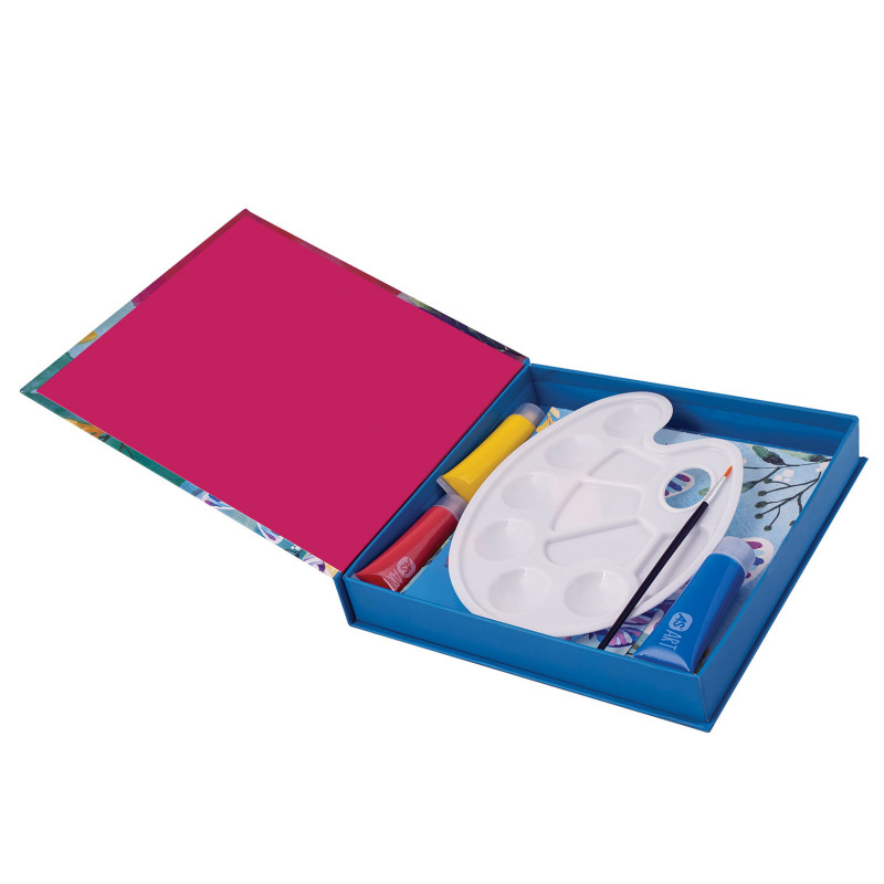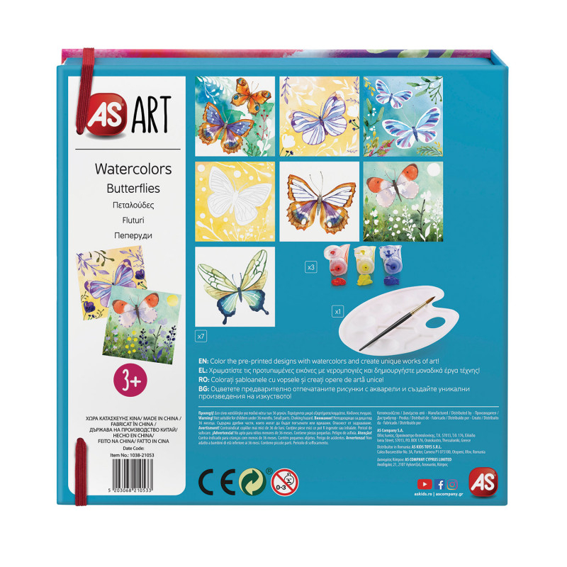 Coloreaza desenele cu acuarele si creeaza opere de arta unice. Contine sabloane cu fluturi: 2 sabloane semi-colorate, 5 sabloane albe, 3 culori de acuarela, 1 paleta, 1 pensula si un ghid detaliat pentru a va ghida in procesul de colorare a desenelor.