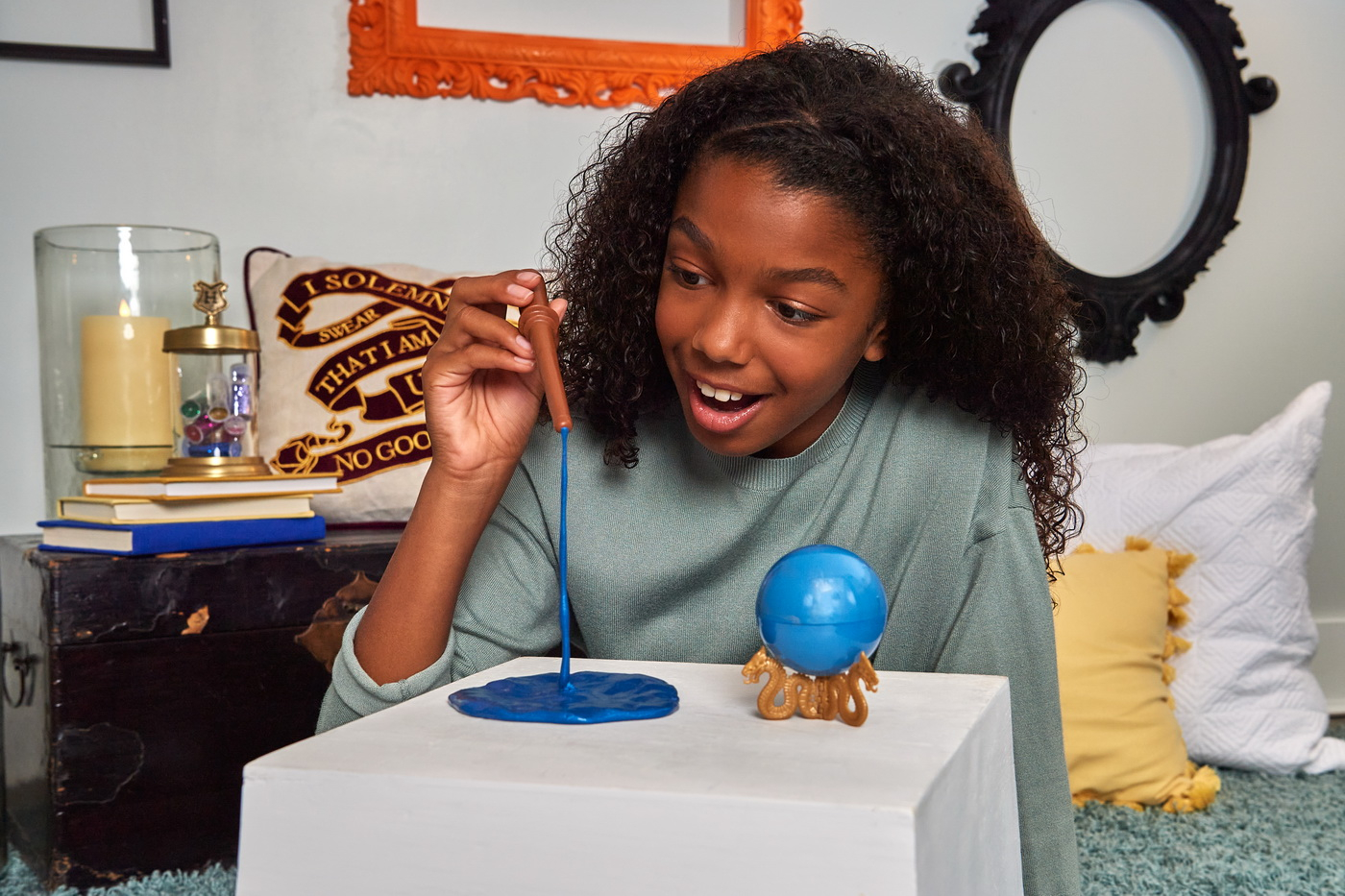 Simtiti magia cunoscuta din lumea lui Harry Potter datorita setului de potiuni magice! Acest set include plastic stralucitor in intuneric si o bagheta Harry Potter de 7 cu lumina LED (3 baterii LR44 incluse). Vrajitoarele, vrajitorii si muggii tineri pot folosi bagheta pentru a experimenta potiuni magice. Deschideti recipientul si intindeti amestecul pentru a-l pregati pentru joaca. Opriti becurile si aprindeti totul cu o bagheta pentru a vedea masa stralucind magic! Potiunile magice pot fi folosite si ca o jucarie senzoriala extraordinara - intindeti, strangeti, strangeti masa si apoi aprindeti-o cu ajutorul unei baghete. Ambalajul este o replica a globului de cristal folosit in ghicire! Acest set fermecator este un cadou minunat Harry Potter pentru copii cu varsta peste 6 ani. Acest set contine un glob albastru.