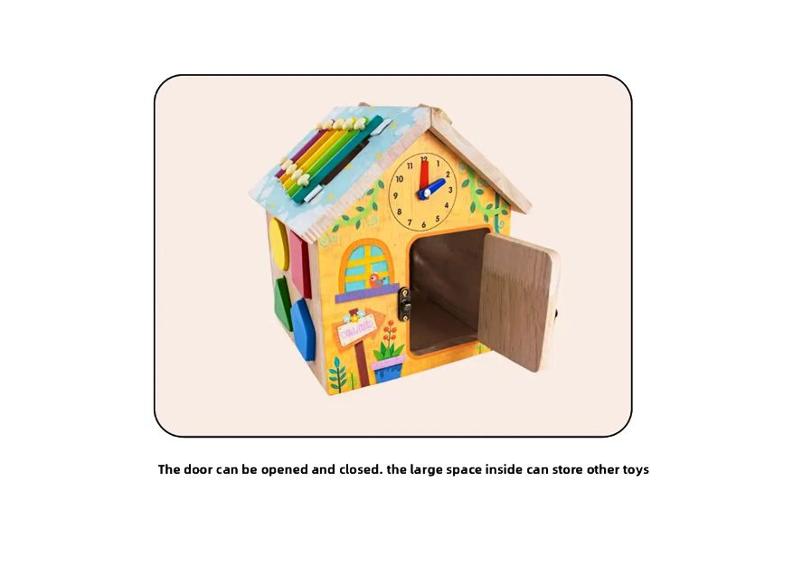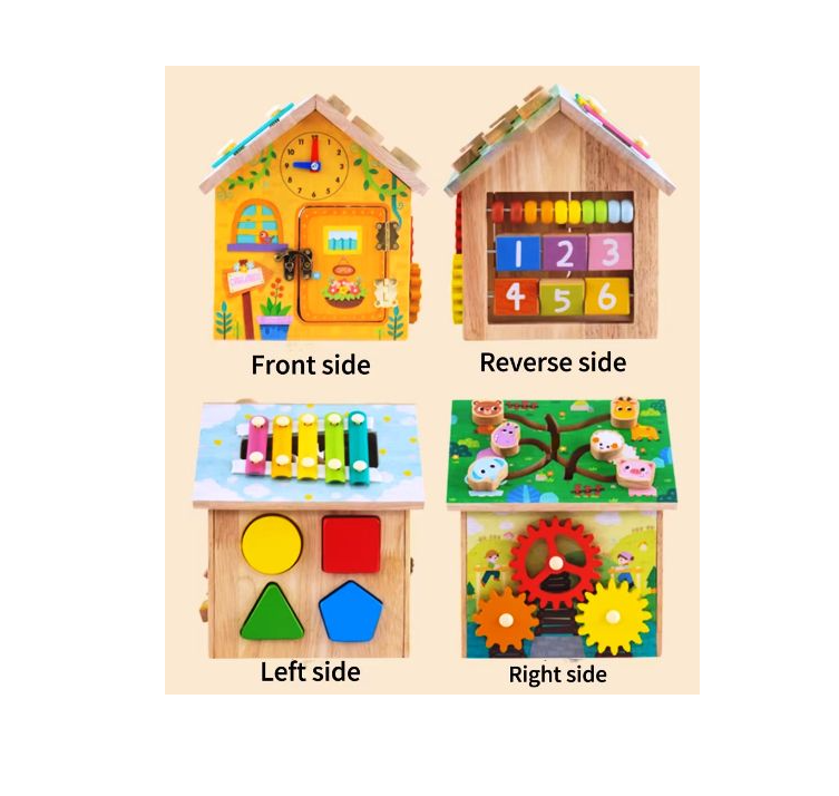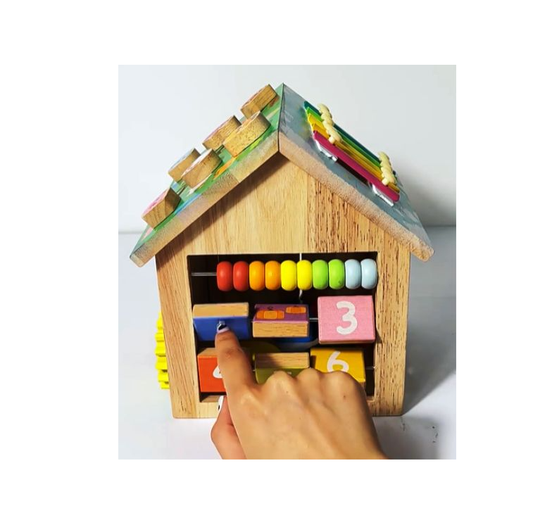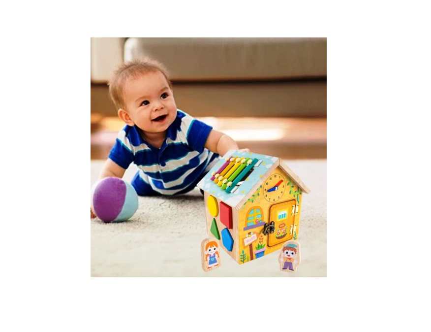 Casuta interactiva din lemn , aduce 8 activitati ce dezvolta motricitatea ,stranesc curiozitatea,