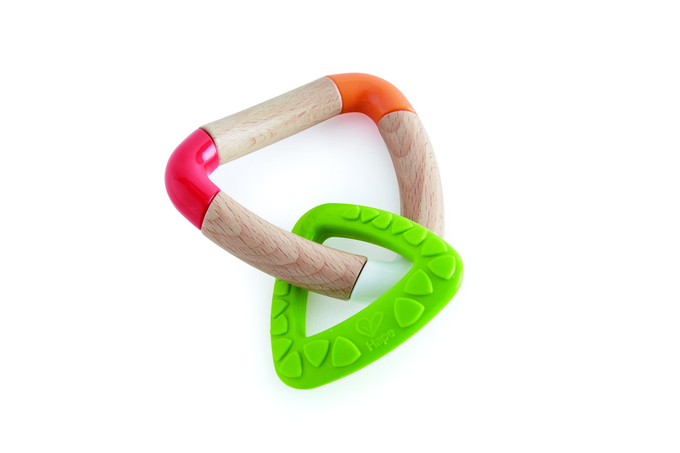 Acesta jucarie pentru dentitie ofera ameliorare bebelusului atunci cand dintii lor mici incep sa apara. Manerul din lemn este placut la atingere si sigur de mestecat, iar triunghiul pentru dinti este fabricat din silicon fara BPA. Le vor placea culorile stralucitoare si formele interesante. Cele doua componente triunghiulare colorate se rotesc una in jurul celeilalte, creand oportunitati de joc. Segmentele de lemn de pe triunghiul mai mare se invart, de asemenea, ajutand la dezvoltarea abilitatilor motorii fine. Usor de prins de bebelusi si usor de transportat si depozitat de catre adulti Jucariile sunt realizate din lemn, folosind materiale ecologice, vopsite in culori atragatoare cu vopsele nontoxice, care depasesc cele mai inalte si stricte standarde internationale de siguranta si calitate, precum EN71, ISO9001, ASTM F963 si altele. De multi ani, Hape a creat jucarii fantastice, de inalta calitate, folosind materiale ecologice si durabile, fiecare produs fiind atent proiectat pentru a stimula abilitatile senzoriale, fizice si emotionale.