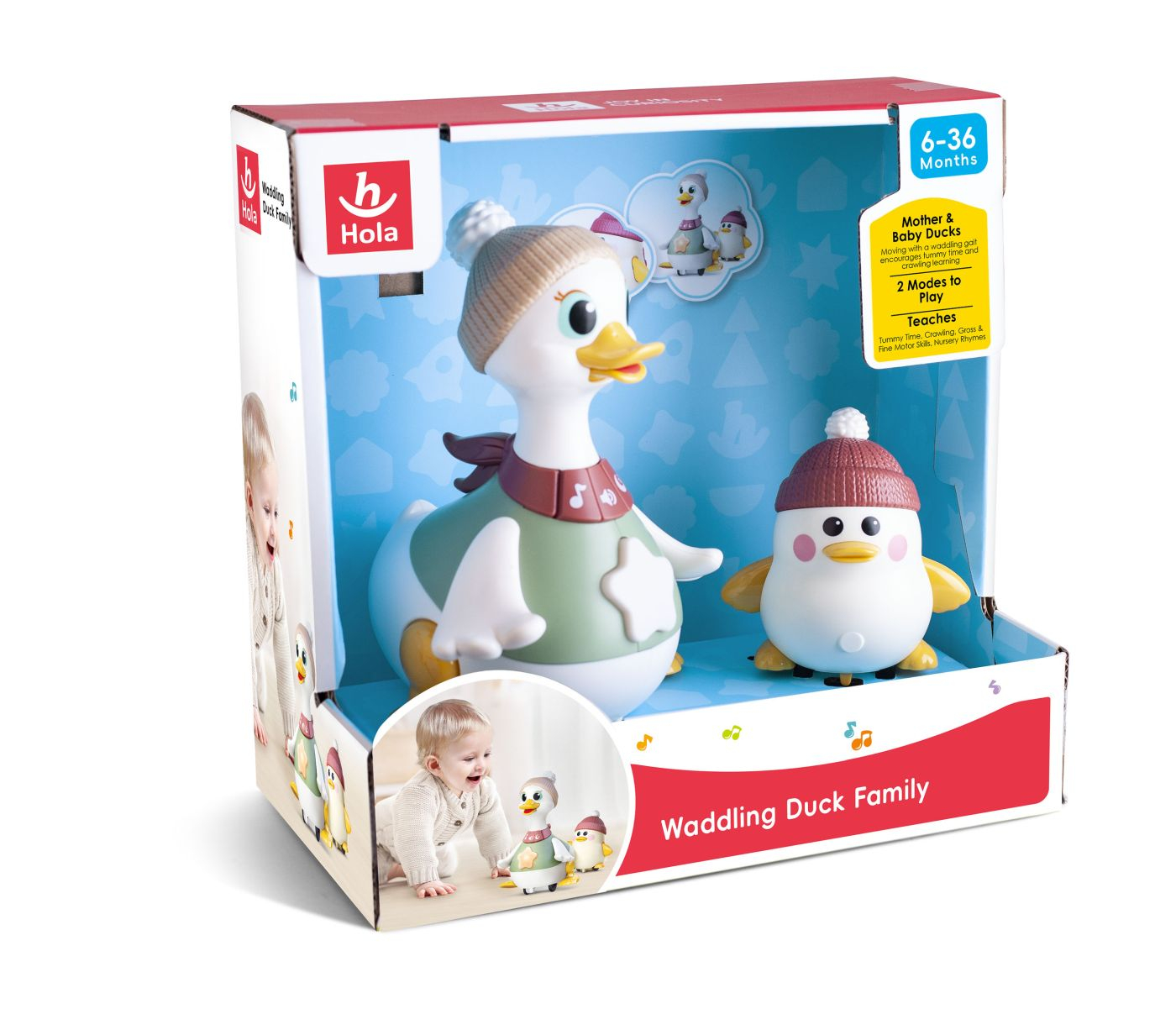 Jucarie interactiva cu mama si pui de rata. Varsta recomandata de utilizare este 6-36 luni. Descopera magia jocului interactiv cu setul de la Hola, special creat pentru a stimula curiozitatea si dezvoltarea armonioasa a bebelusilor. Setul include o rata mama si un pui adorabil, amandoi purtand caciulite simpatice, gata sa ii insoteasca pe cei mici in aventuri distractive. Caracteristici principale: 2 moduri de joaca: Modul de mers cu balans si modul de urmarire pentru incurajarea miscarii si a taratului. Miscare realista: rata mama se deplaseaza leganandu-se, captand atentia copilului si stimuland reflexul de urmarire. Sunete si melodii: Include cantece de leagan, rime si efecte sonore prietenoase, care incurajeaza recunoasterea auditiva si invatarea prin joaca. Design atractiv: Culori vii, forme rotunjite si detalii prietenoase pentru bebelusi, potrivite mainilor mici. Functie educativa: Ajuta la dezvoltarea abilitatilor motorii fine si grosiere, a coordonarii mana-ochi si a atentiei. Beneficii pentru copil: incurajeaza taratul, mersul si miscarea activa, stimuleaza simtul auditiv si vizual, dezvolta coordonarea si echilibrul, sprijina invatarea prin imitatie si joc. Continut pachet: 1 rata mama interactiva, 1 pui de rata detasabil. O jucarie perfecta pentru primele etape de dezvoltare, care imbina distractia cu invatarea intr-un mod sigur si captivant.