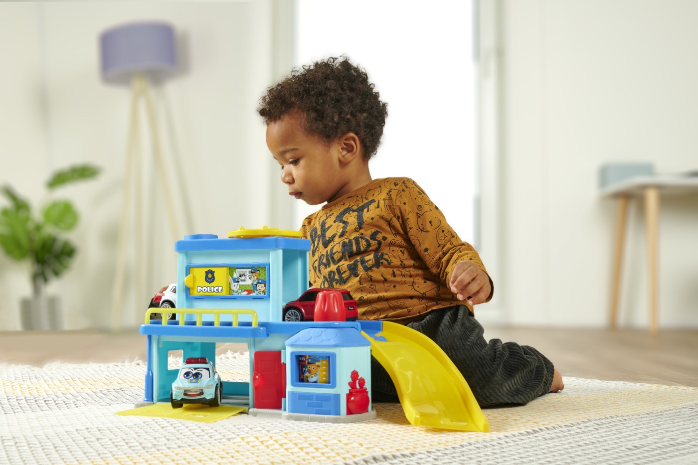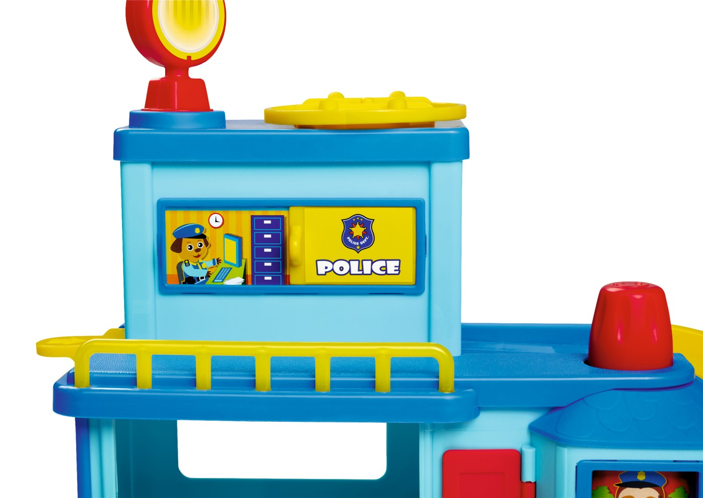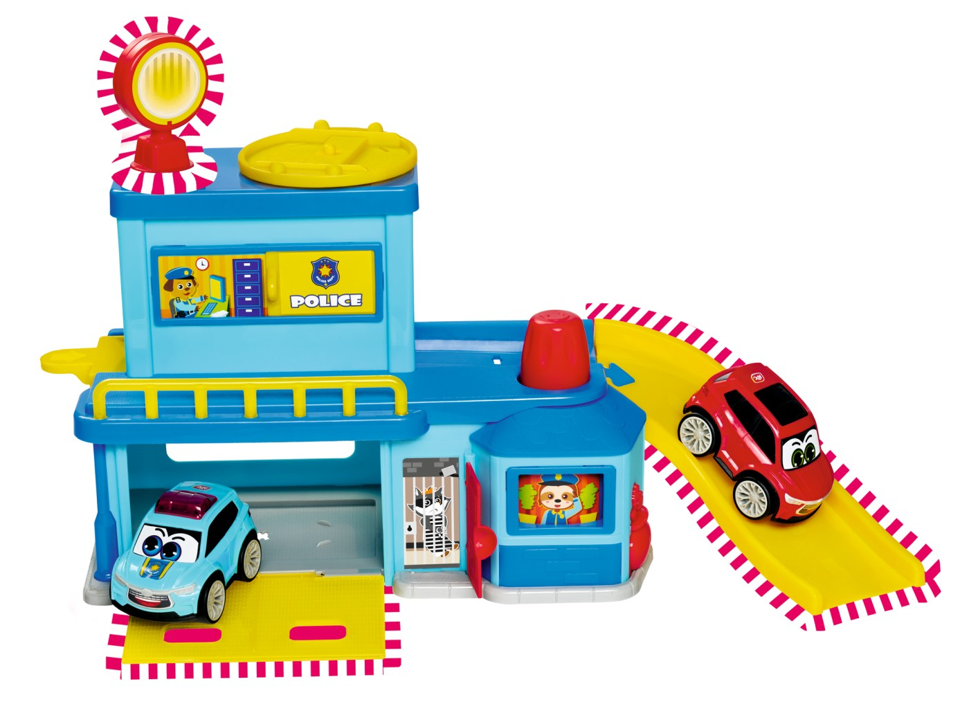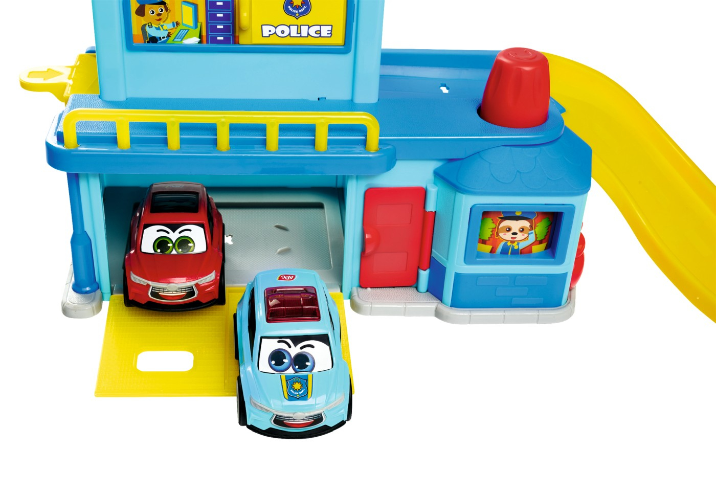 Sectie de politie cu rampa de pornire si platforma rotativa pentru masini, lansator de masini, usa de garaj cu deschidere si usa care se deschide spre camere. Setul include si 2 masinute.