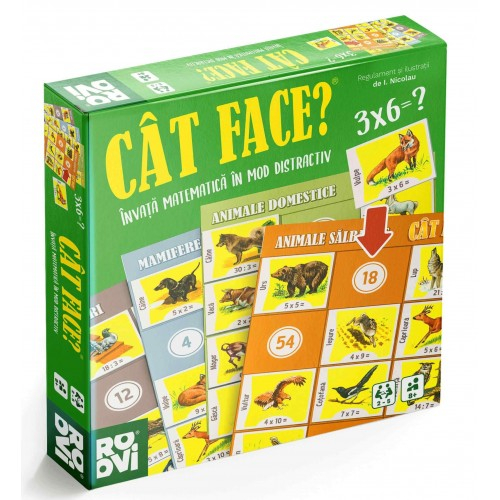 JOC EDUCATIV SI DE SOCIETATE CARE IMPLICA EFECTUAREA CALCULELOR MATEMATICE SI ASOCIEREA REZULTATELOR CU IMAGINILE ANIMALELOR CORESPUNZATOARE. "Cat face?" este unul dintre jocurile concepute si ilustrate de I.Nicolau, alaturi de foarte-cunoscutul joc "Animale din continente". Acest joc este ideal pentru invatarea operatiilor matematice atat la scoala, cat si acasa, intr-un mod placut si relaxant pentru copil. Totodata, jocul le ofera celor mici detalii despre animalele de pe cartile de joc. Numar participanti: 2-5 jucatori. Varsta recomandata:8-14 ani. Continut:4 planse de joc, 48 carti de joc, regulament de joc.Dimensiune cutie:30x30x5 cm