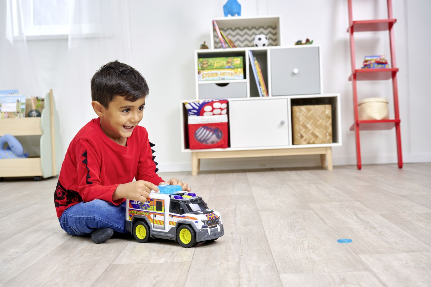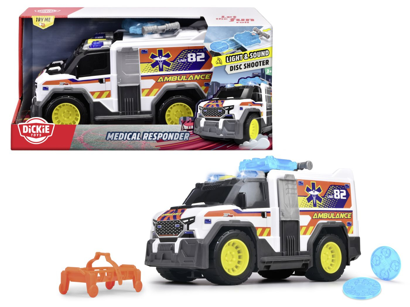 Ambulanta mare cu functie de tragere si accesorii, pentru copii cu varsta peste 3 ani, cu lumina si sunet. Dispozitivul de tragere de pe acoperisul masinii de jucarie este folosit pentru a lansa discurile albastre incluse, care au gravuri grozave care infatiseaza apa si drone. Furgoneta paramedicilor are un compartiment lateral si o usa din spate care poate fi pliata pentru a forma o rampa pentru incarcarea si descarcarea comoda a targii furnizate. Masina de salvare se indreapta spre medicul de urgenta cu lumina albastra si sirena si este sustinuta de zgomotele de pornire a motorului si de conducere.