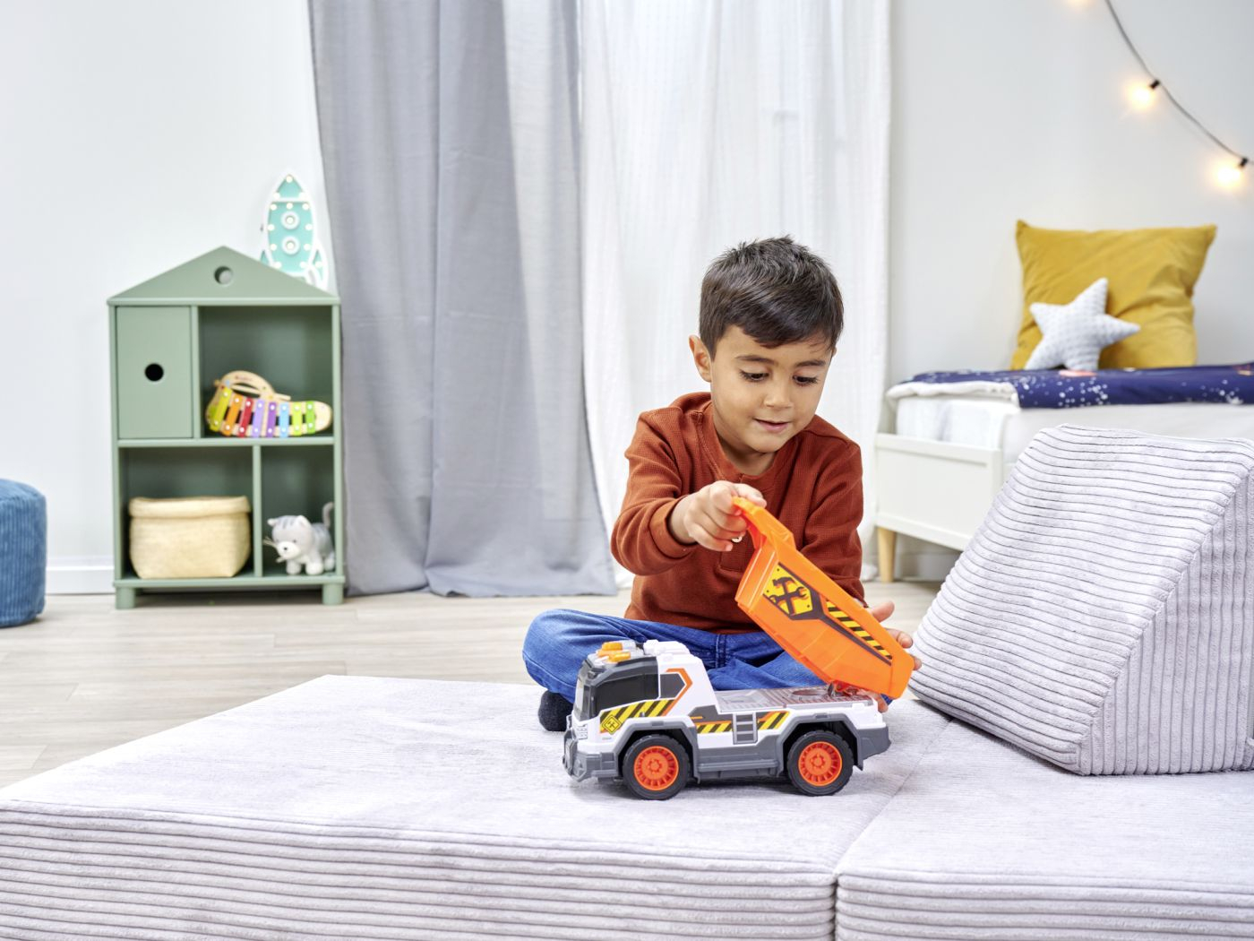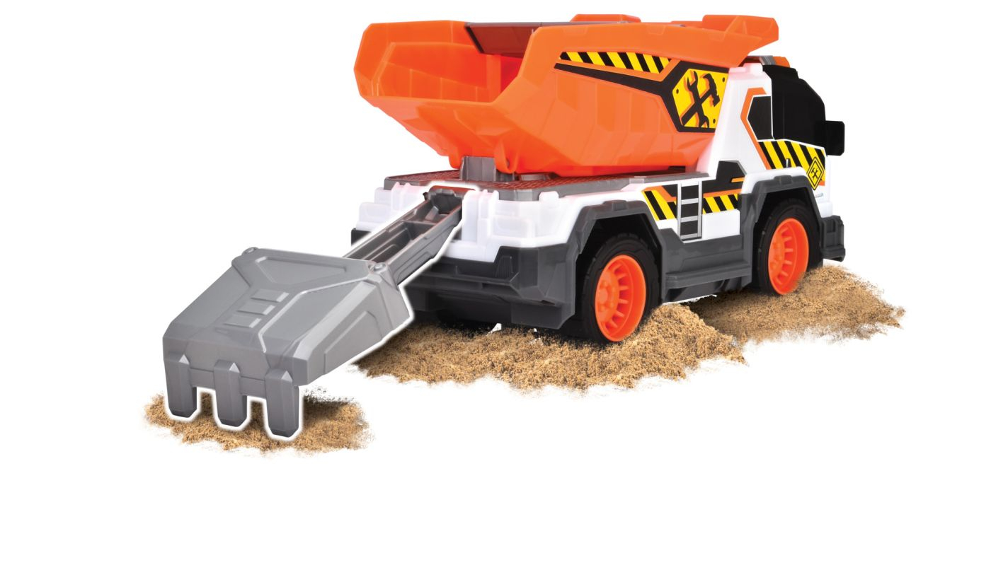 Basculanta (30 cm) cu lopata si sita pentru groapa de nisip - masina de jucarie pentru copii cu varsta peste 3 ani, cu lumina si sunet. Dumperul este echipat cu o lumina de avertizare si pornire realista a motorului, bip invers si sunete de descarcare a resturilor. Camion basculant cu functie de basculare - perfect pentru groapa de nisip si locul de joaca.