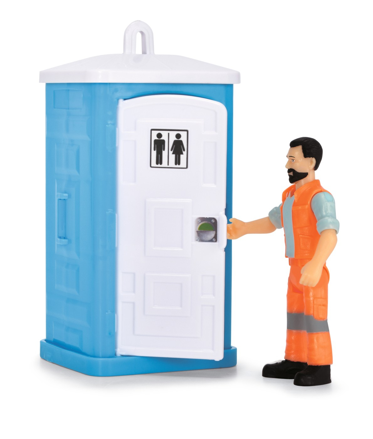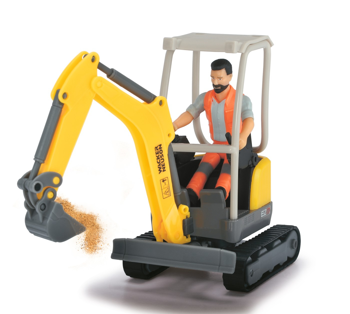 Setul contine un excavator Neuson, o figurina, toaleta, semne rutiere si accesorii, iar cabina excavatorului este rotativa. Toaleta are sunet, iar excavatorul are lugimea de 15 cm .