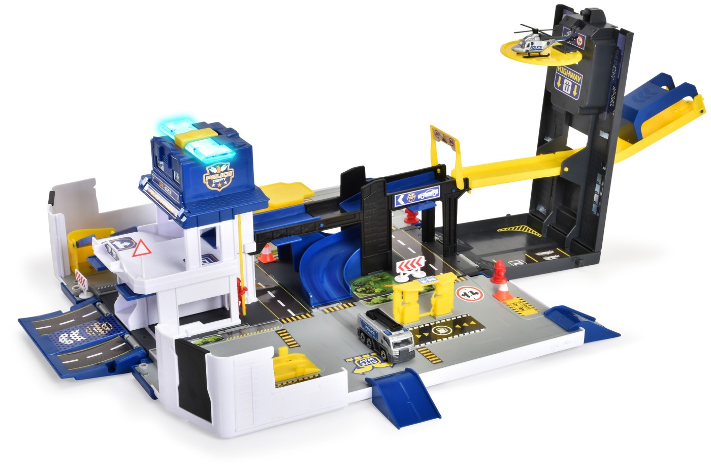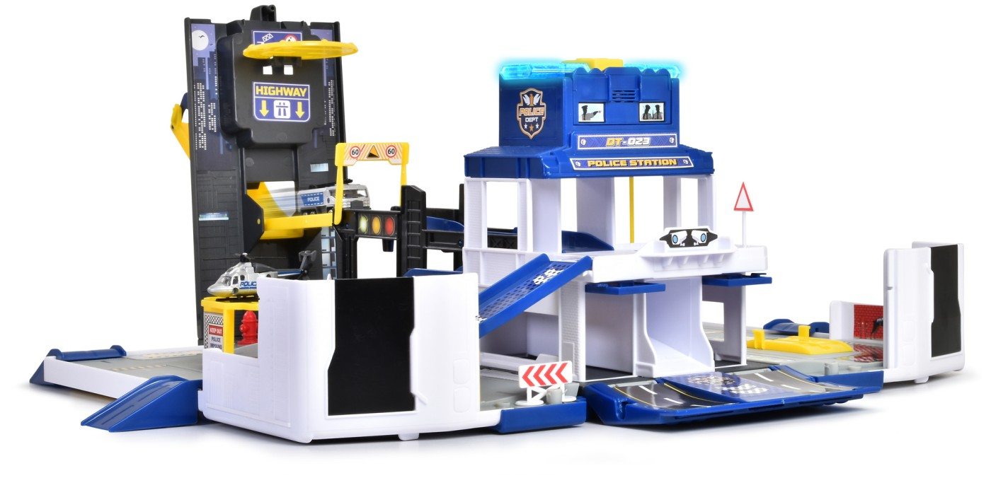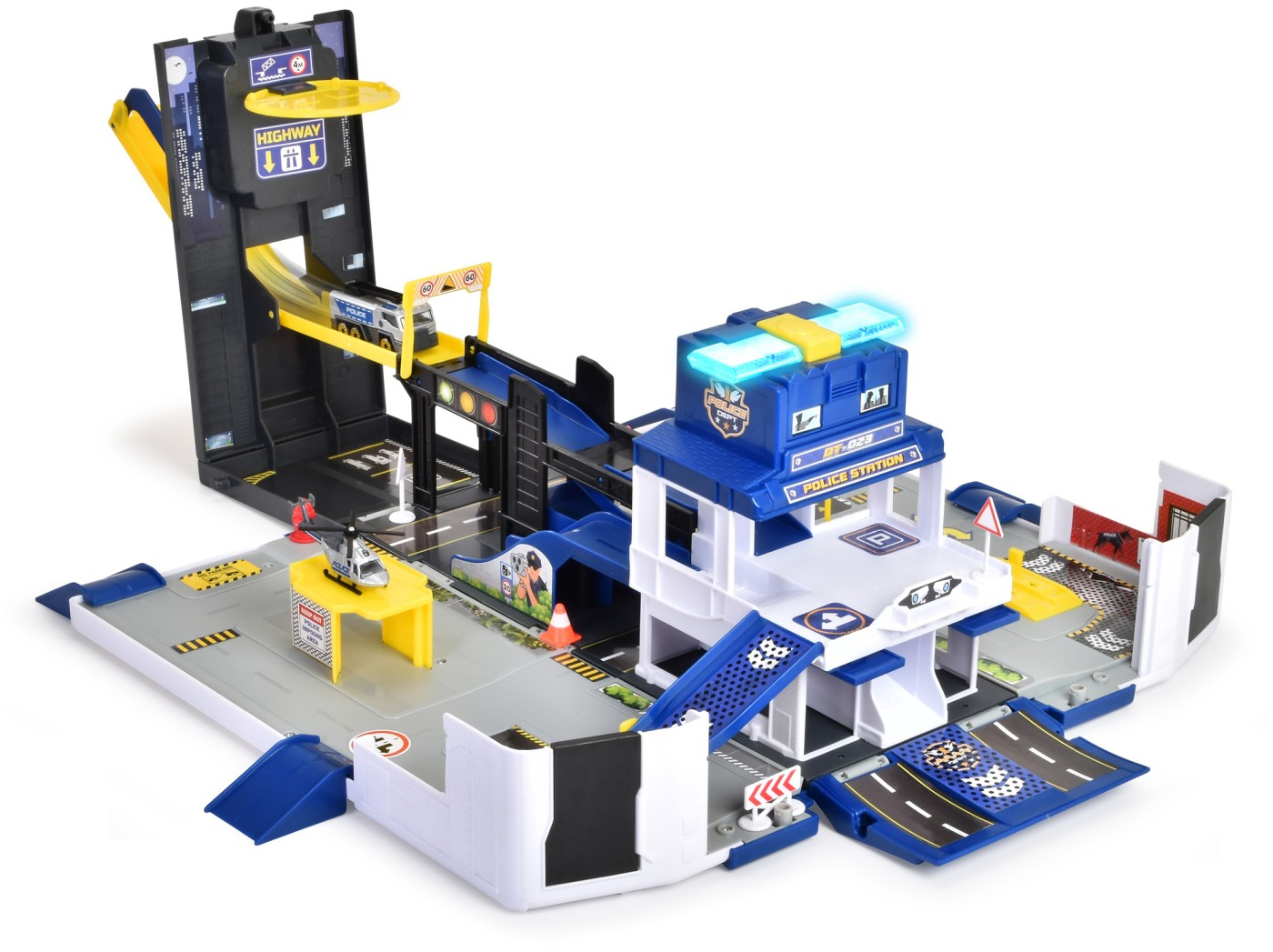 Set de joaca pentru micii politisti, pliabil, de la Dickie Toys: statie de politie pliabila cu efecte de lumina si sunet. Cu setul de joc Folding Police Truck de la Dickie Toys, visele micilor politisti devin realitate: vehiculele cu roata libera de toate tipurile pot fi mutate pe mai multe niveluri. Exista chiar si rampe de sarituri! Numeroase accesorii precum o masina de politie, un elicopter, semne de circulatie si conuri de circulatie, precum si efectele sofisticate de lumina si sunet garanteaza distractia suprema.