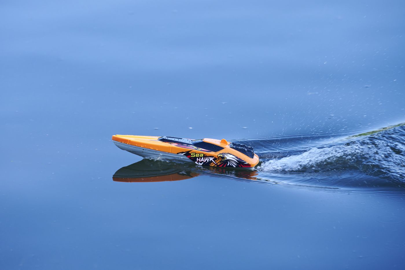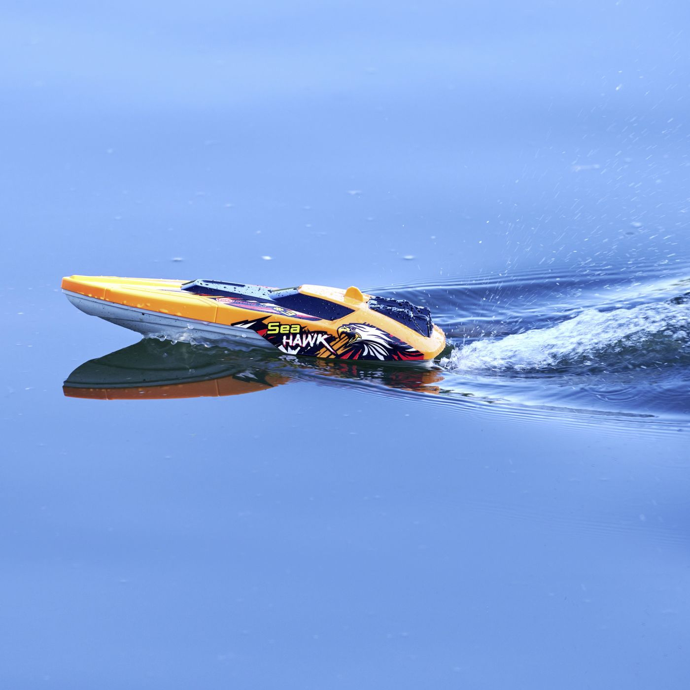 Barca cu telecomanda „Sea Hawk” este perfecta pentru copii de 6 ani si peste, ideala pentru distractie in piscine sau lacuri. Dispune de functie de siguranta si Turbo Boost, telecomanda pe frecventa 2,4 GHz si o viteza maxima de 4 km/h. Cu un design alungit de 33 cm si un corp portocaliu stralucitor, barca RC de la Dickie Toys atrage toate privirile! Poate fi controlata in toate directiile, avand o raza de actiune de pana la 30 de metri – perfecta pentru aventuri pe apa dulce. Atentie: nu este potrivita pentru utilizare in apa de mare. Senzorii incorporati asigura ca elicele functioneaza doar cand barca este in apa. Telecomanda cu 2 canale este rezistenta la stropire.