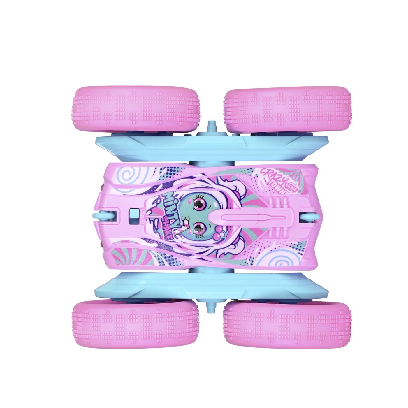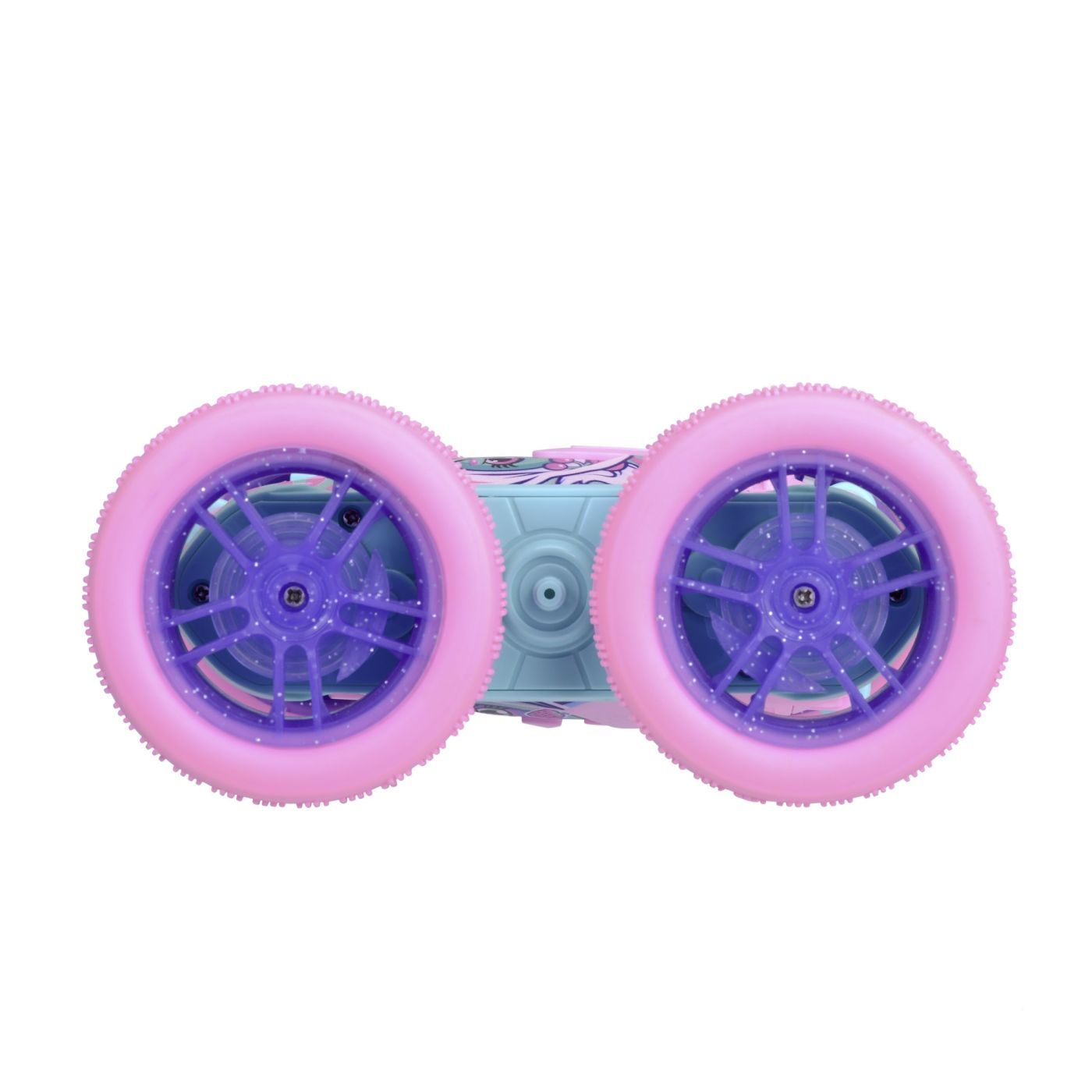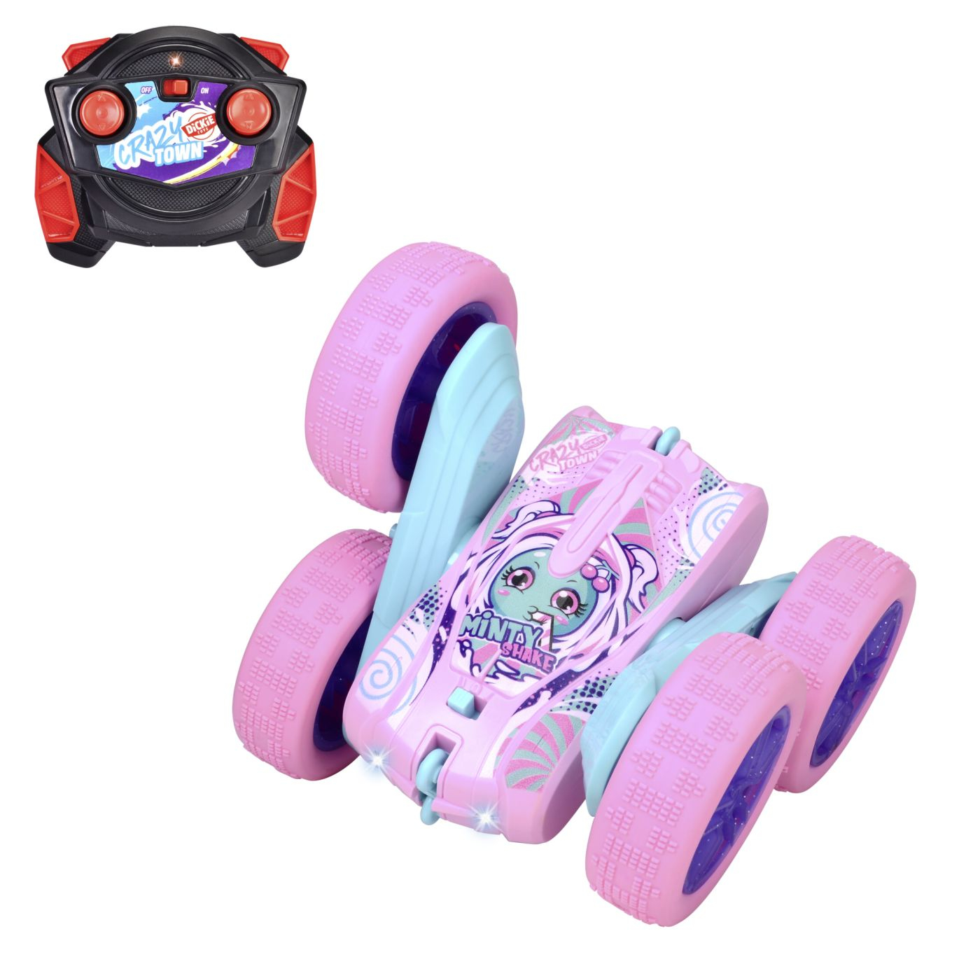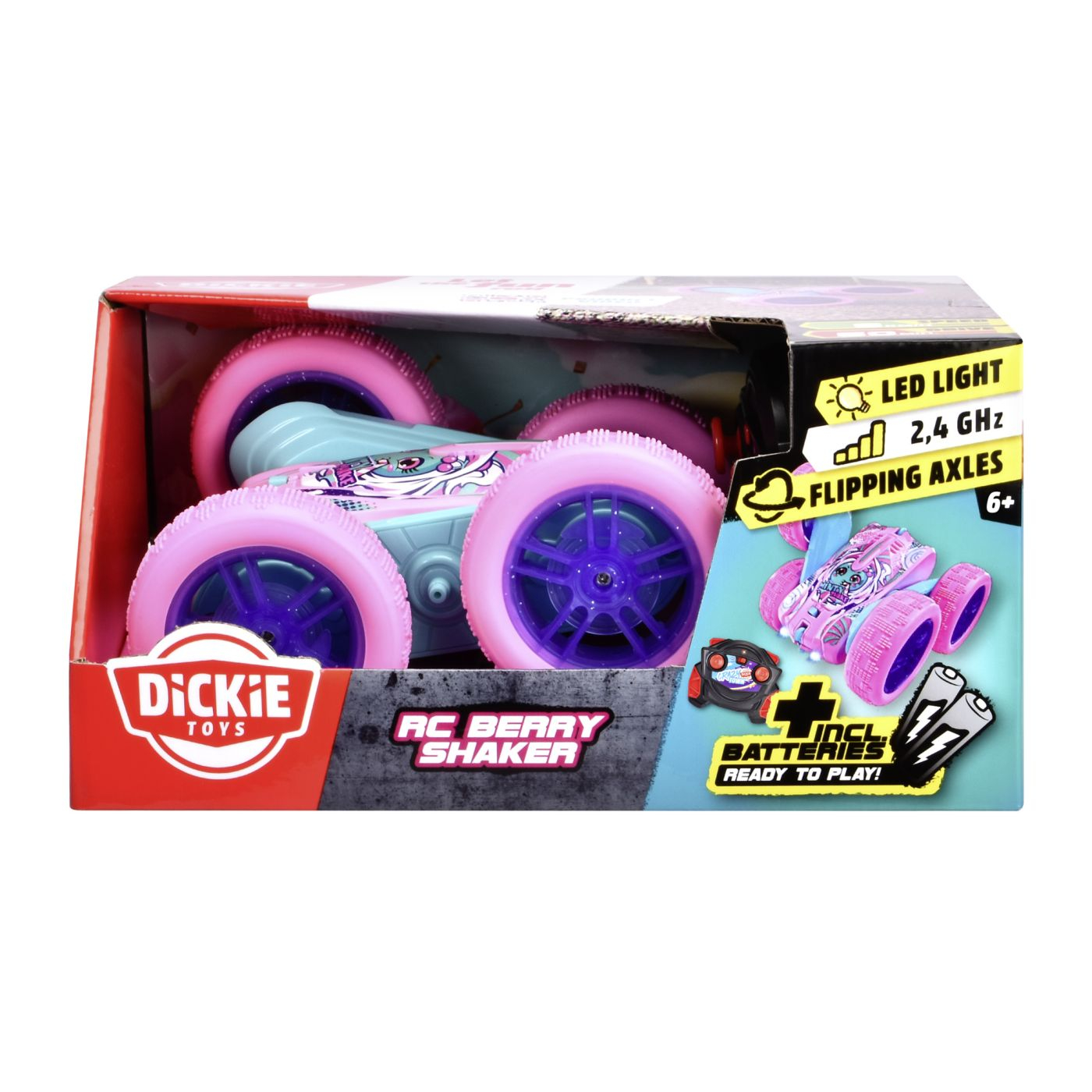 Dickie Toys - Masina cu telecomanda Berry Shaker - masina cu telecomanda pentru copii de la 6 ani in sus, pentru cascadorii la 360°, 8 km/h, telecomanda 2,4 GHz, baterii incluse, gata de joc. Datorita axelor rotative, copiii pot realiza sarituri spectaculoase si rostogoliri uimitoare la viteze de pana la 8 km/h cu aceasta masina RC de 16 cm. Schimbarile bruste de directie nu sunt o problema pentru telecomanda cu 2 canale si functii complete de control. Cu frecventa de 2,4 GHz, pot fi controlate pana la 16 vehicule simultan, fara interferente. Echipata cu roti din cauciuc de inalta calitate, masina de jucarie poate rula pe aproape orice suprafata, atat in interior, cat si in exterior. Designul roz al masinii de cascadorii este deosebit de apreciat de fete.