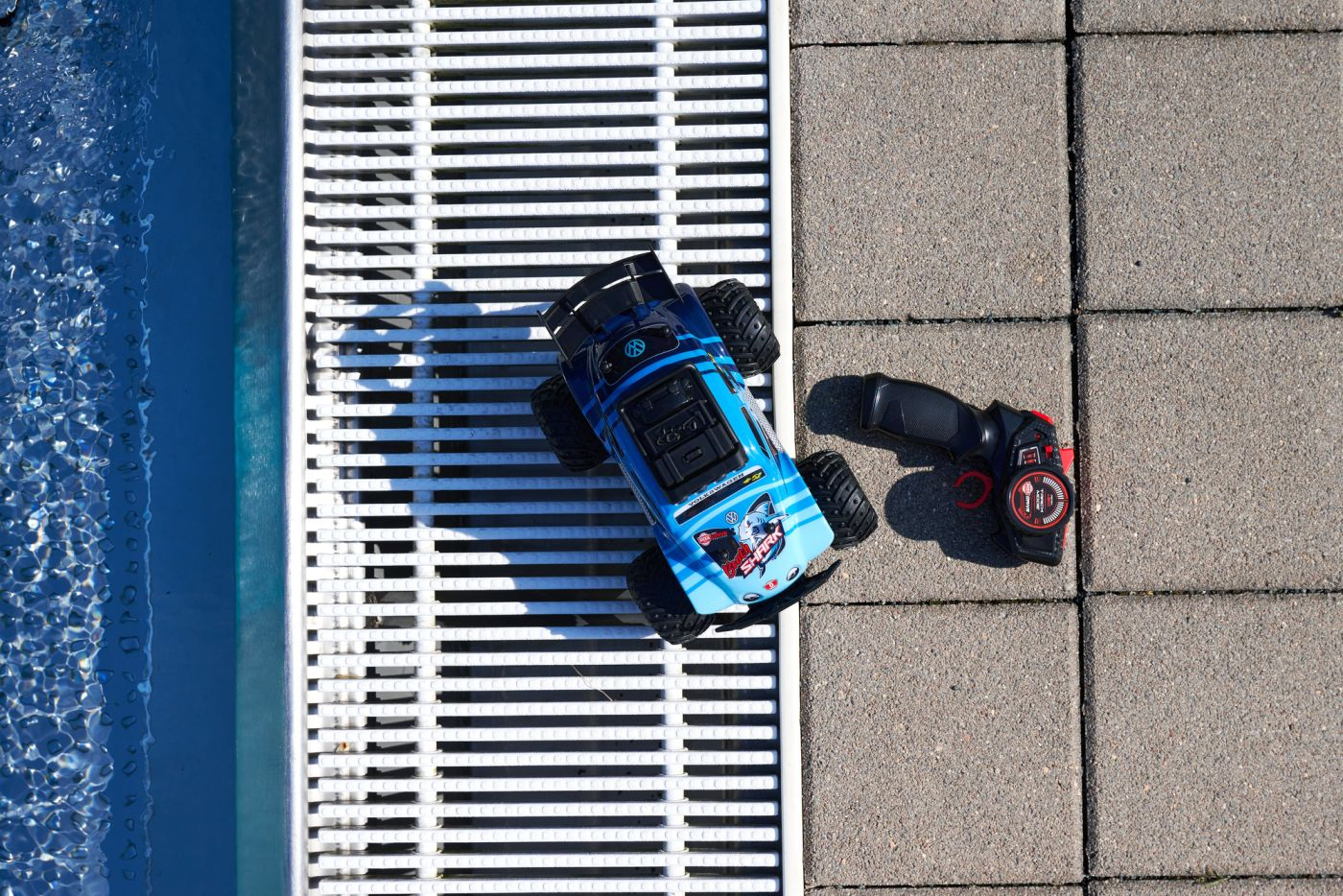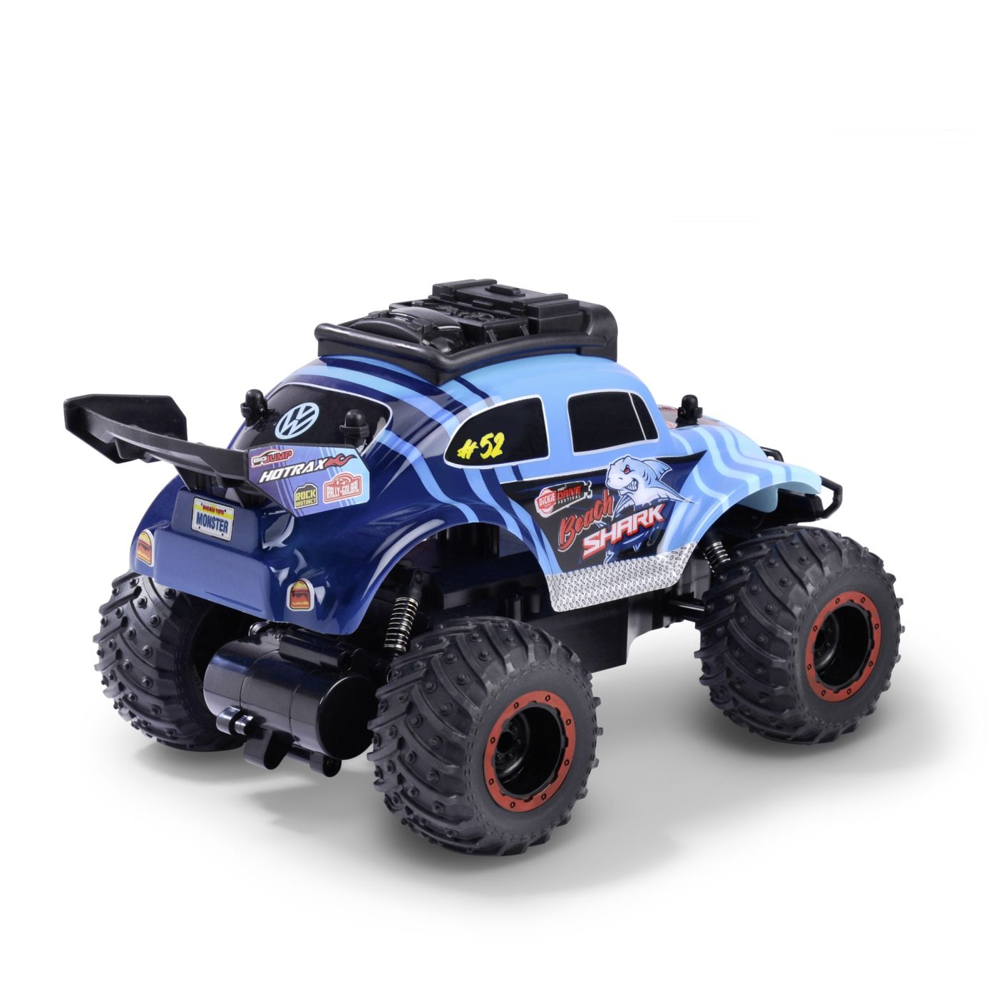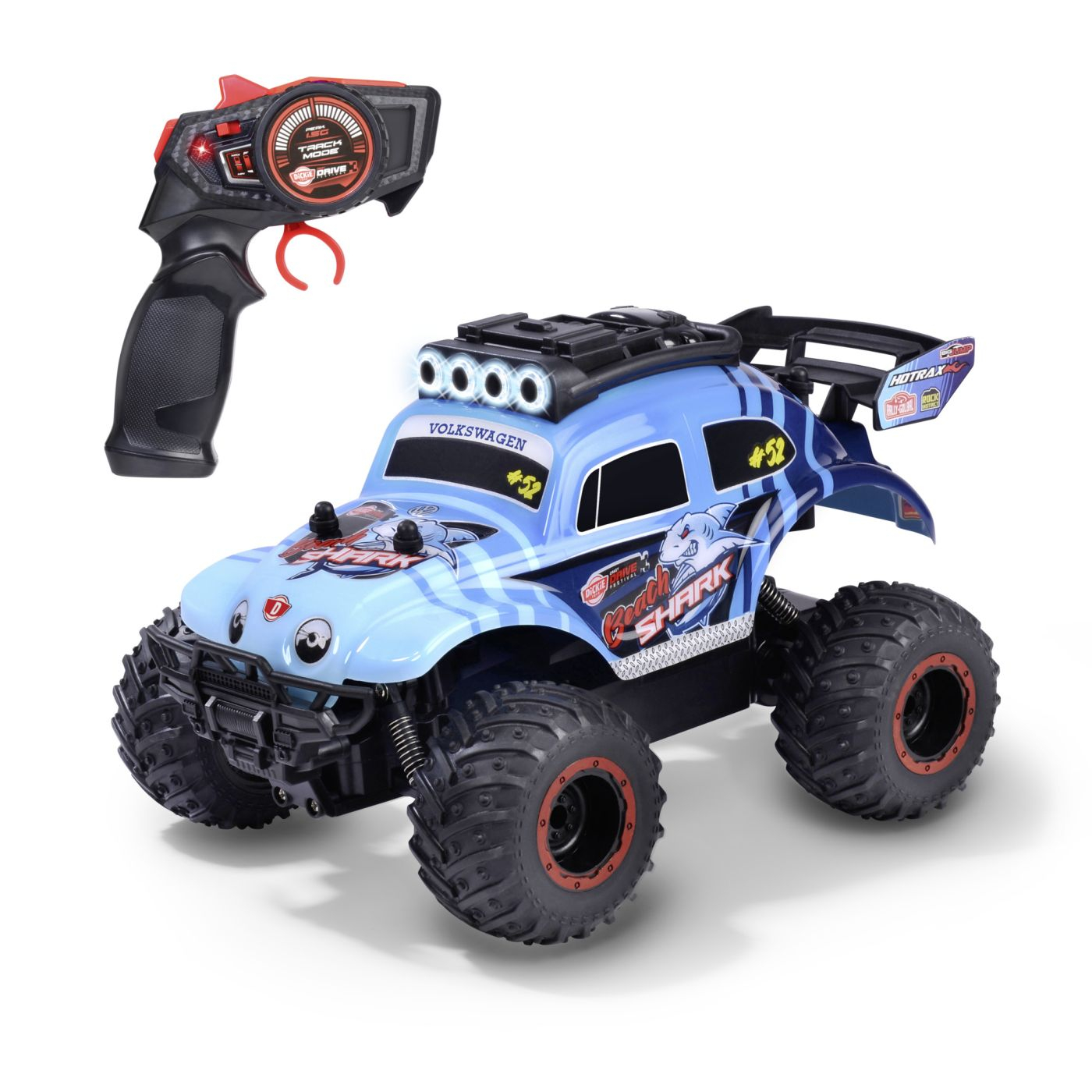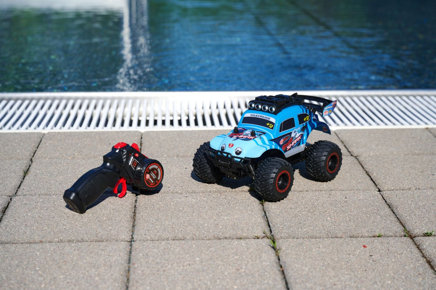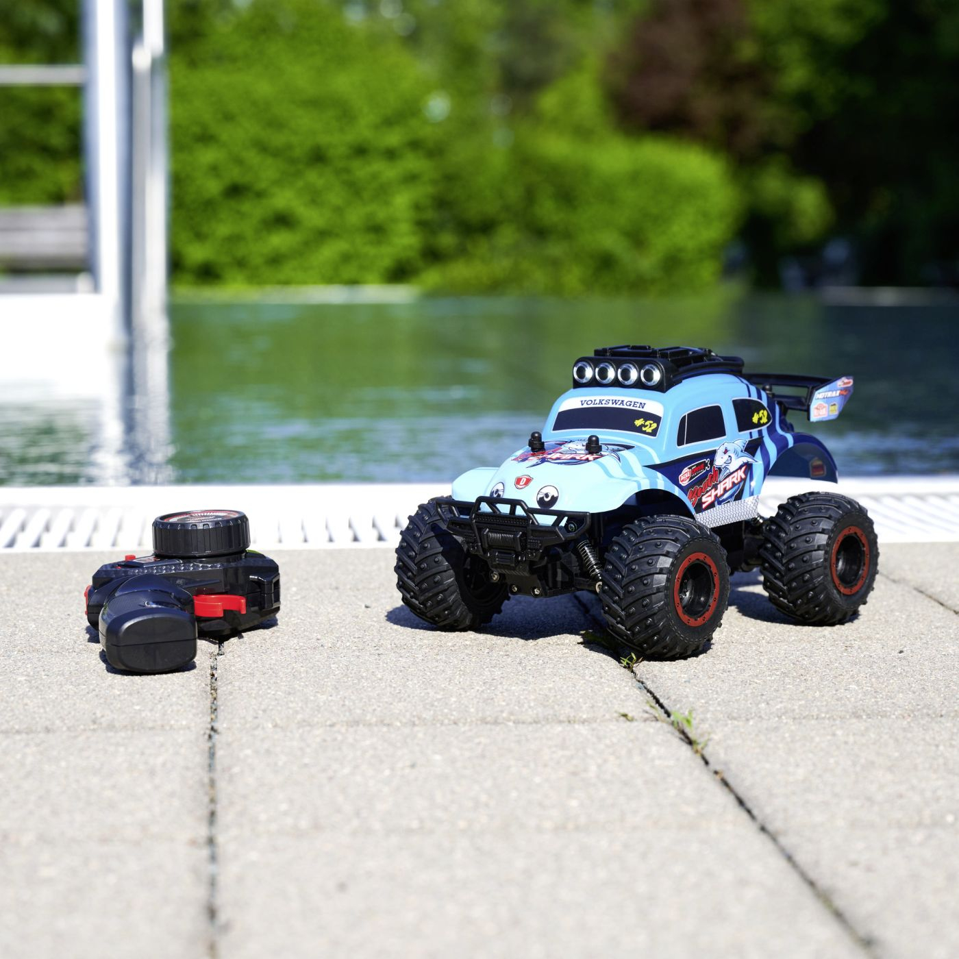 Dickie Toys - Masina cu telecomanda Volkswagen Beetle Monster Bug (23 cm) - masina cu telecomanda cu lumina si functie turbo pana la 12 km/h, masina cu telecomanda pentru copii cu varsta de peste 6 ani, telecomanda 2,4 GHz, incl. baterii si baterie reincarcabila. Nu poate exista un alt model care sa fie la fel de potrivit ca masina de jucarie off-road cu telecomanda precum Volkswagen Baja Bug, dezvoltata special pentru teren accidentat! Soferii tineri cu varsta de 6 ani si peste sunt ajutati de farurile LED de pe acoperisul masinii si de functia turbo boost, care accelereaza vehiculul albastru de la 9 la 12 km/h. Masinuta de jucarie cu telecomanda pe 2 canale, 2,4 GHz pentru pana la 16 vehicule simultan, 23 cm, 12 km/h, standby dupa 3 min., incl. baterii, incarcare USB 90 min., timp de condus 20 min.