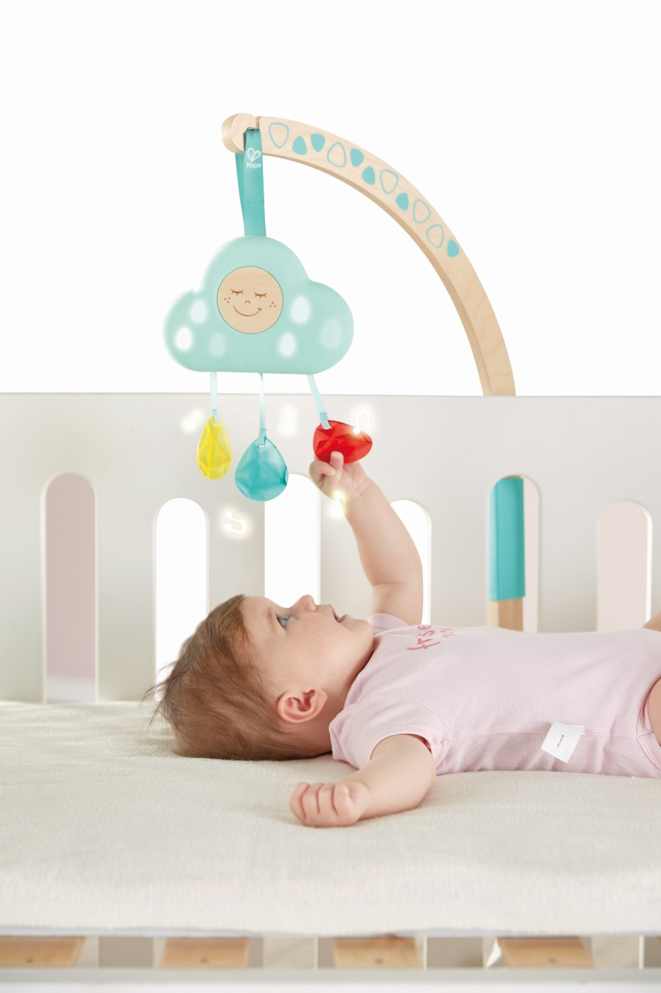 Ajuta-i pe micutii tai sa doarma linistiti cu aceast minunat norisor musical cu lumina. Dispune de trei picaturi de ploaie agatate, care va permit sa modificati setarile de iluminare si sa selectati intre 10 piese audio, inclusiv opt melodii blande si batai de inima linistitoare si sunete de ploaie. Dispune de un cronometru si un senzor care va activa norul daca bebelusul tau se trezeste plangand! Se ataseaza usor de un patut, patut sau carucior. Trageti de picatura galbena de ploaie pentru a regla setarile de lumina intre luminos, slab si un impuls bland. Trageti picatura albastra pentru a activa sau a dezactiva sunetul si lumina. Picatura de ploaie rosie selecteaza intre opt melodii muzicale, batai de inima si efecte sonore de ploaie linistitoare. Va permite sa atarnati norul la trei inaltimi diferite. O modalitate perfecta de a-i ajuta pe micuti sa doarma linistiti. Jucariile sunt realizate din lemn, folosind materiale ecologice, vopsite in culori atragatoare cu vopsele nontoxice, care depasesc cele mai inalte si stricte standarde internationale de siguranta si calitate, precum EN71, ISO9001, ASTM F963 si altele. De multi ani, Hape a creat jucarii fantastice, de inalta calitate, folosind materiale ecologice si durabile, fiecare produs fiind atent proiectat pentru a stimula abilitatile senzoriale, fizice si emotionale.