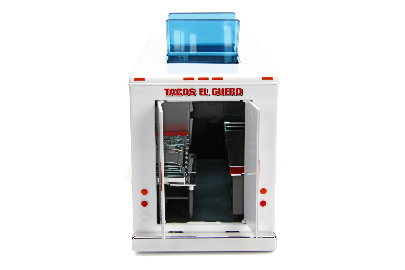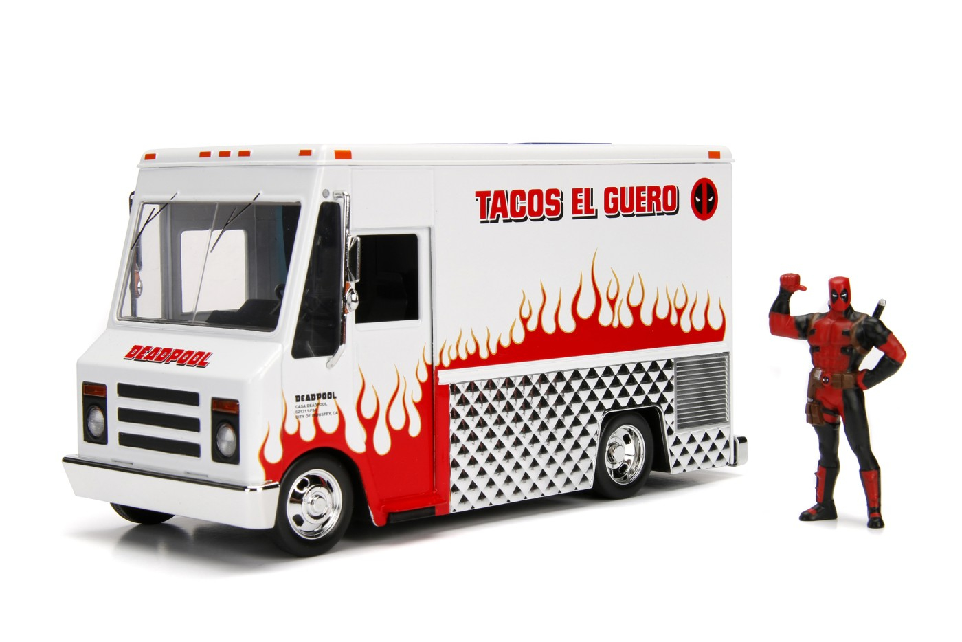 Dispunand de usi retractabile de acoperis si ferestre de serviciu, usa de intrare glisanta si bucatarie mobila realista, acest camion Taco la scara 1:24 va fi un remarcabil in orice colectie Deadpool. Include o figurina Deadpool 100% turnata sub presiune.